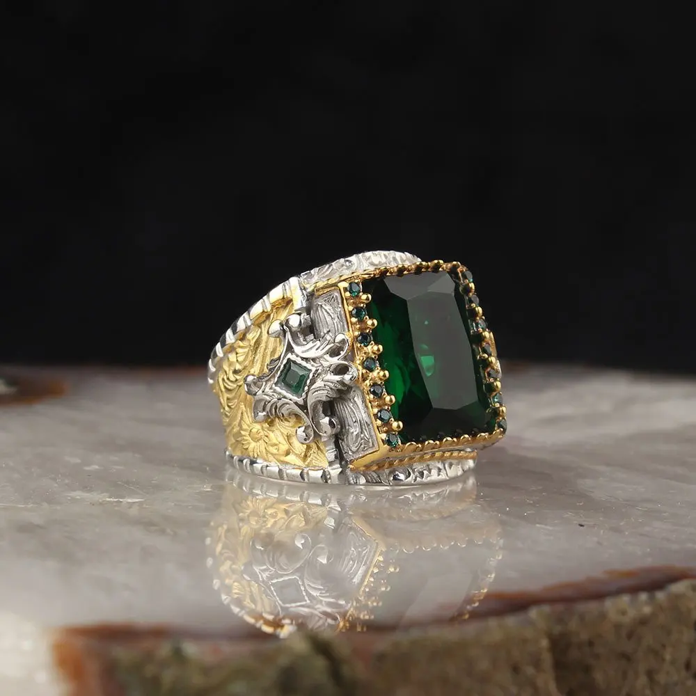 Мужское кольцо из серебра с зеленым цирконием и родиевым покрытием