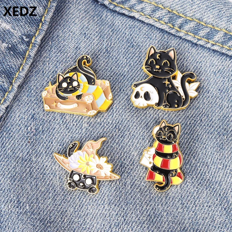 Эмалированная брошь XEDZ с мультяшным черным котом, Подсолнух, рыбалка, шляпа, Череп, кошка, банное полотенце, модная металлическая брошь с сокровищами, булавка, ювелирное изделие
