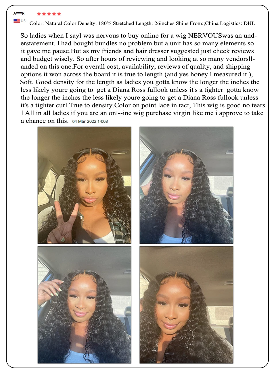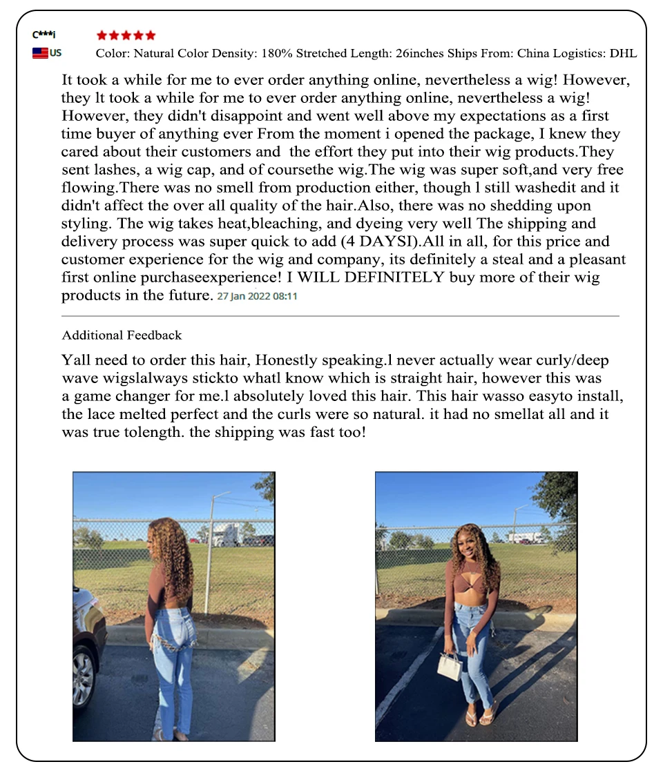 Я был скептически настроен по поводу заказа волос, потому что я прочёл несколько плохих отзывов, но эти волосы я рад, что получил шанс и заказал их. Кружево выглядело очень хорошо по сравнению с другими компаниями, которые я заказал. Волосы были очень мягкие и выглядят точно так же, как на картинке. Хорошо сидит и туго. Я думаю заказать парик с объемной волной в 11,11 продаже.