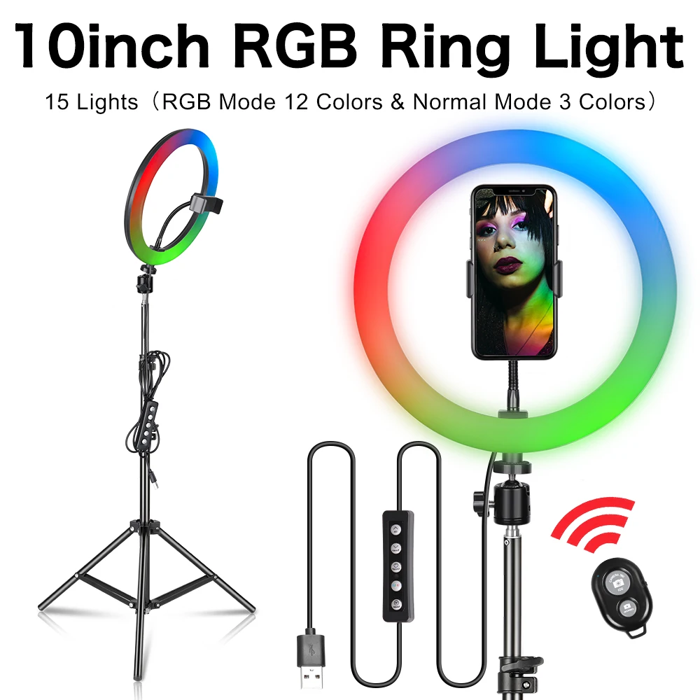 Тип: кольцевой светильник для селфиСостояние: абсолютно новыйКоличество лампочек: 128 шт.Люмен: 2400-3000LMЦветовая температура: 2200-5500KЦветовая температура RGB: 12 цветовСветовой угол: 120 градусовРабочий Источник питания: 5 В постоянного токаМощность: 13-26 ВтСрок службы: нормальное использование может быть исследовано до 30000 часовМатериал: АБС-пластик, ПП пластик, углеродистая сталь, алюминиевый сплавПодходит для телефона для 3,5-6.5inСветильник Размеры Наружный диаметр: 6/10in