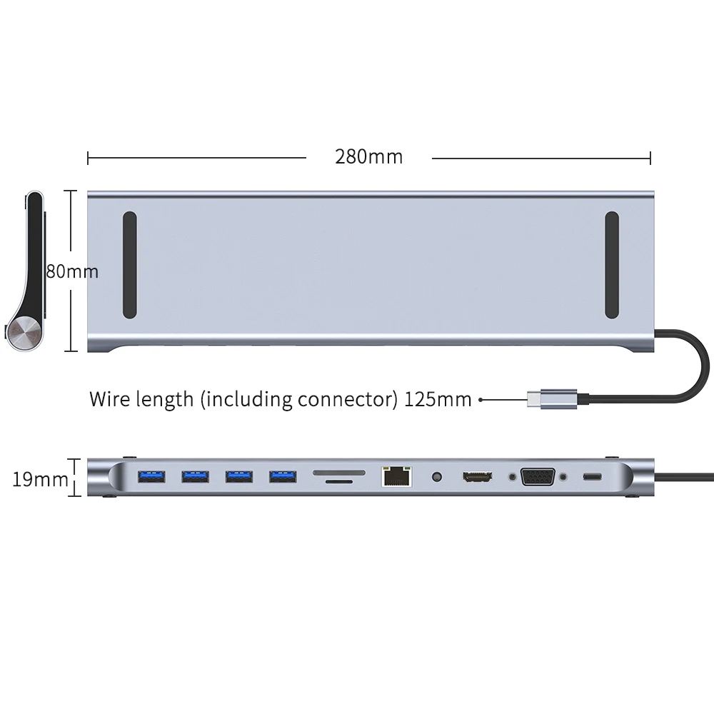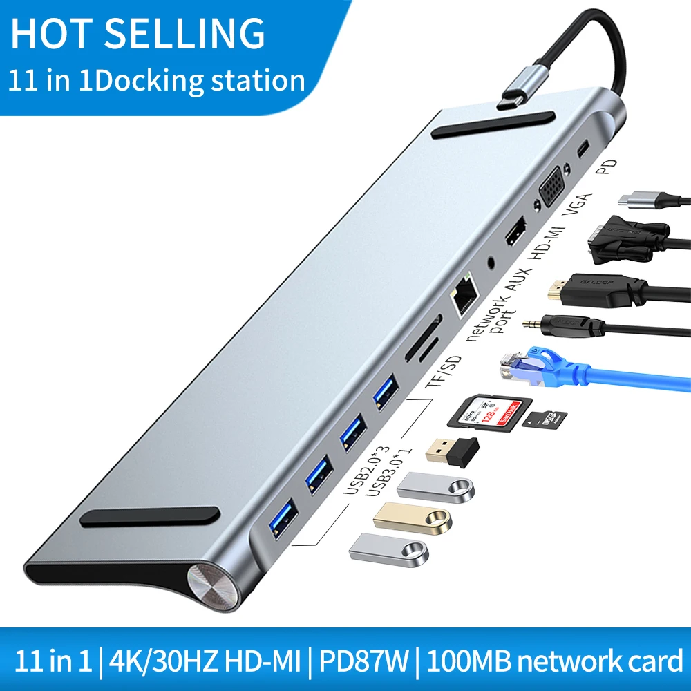 11 в 1 хаб: RJ45(100 Мбит/с) * 1 + USB 3,0*1 + USB2.0 * 3 + HDMI * 1 + PD(87 Вт) * 1 + Aux * 1 + VAG * 1 + SD * 1 + TF * 1