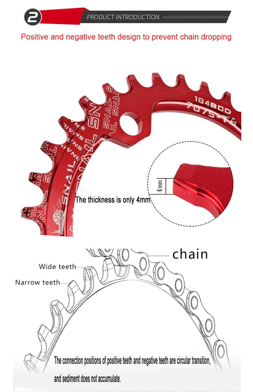 Узкий широкий зуб помогает цепи анти-падение. Сверхлегкий дизайн и кольцо с одной цепью помогает сохранить 1 кг для вашего велосипеда по сравнению с кольцом с двойной цепью.