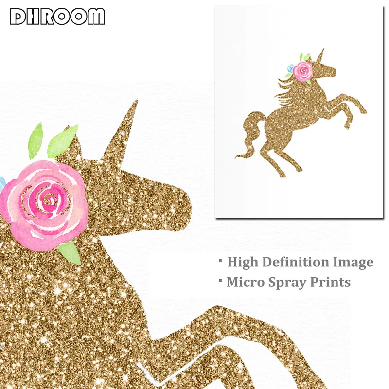 Настенная картина в скандинавском стиле с единорогом, золотые блестящие принты, розовая детская комната, облако, радуга, холст, постер, картина, Настенная картина, декор для детской комнаты