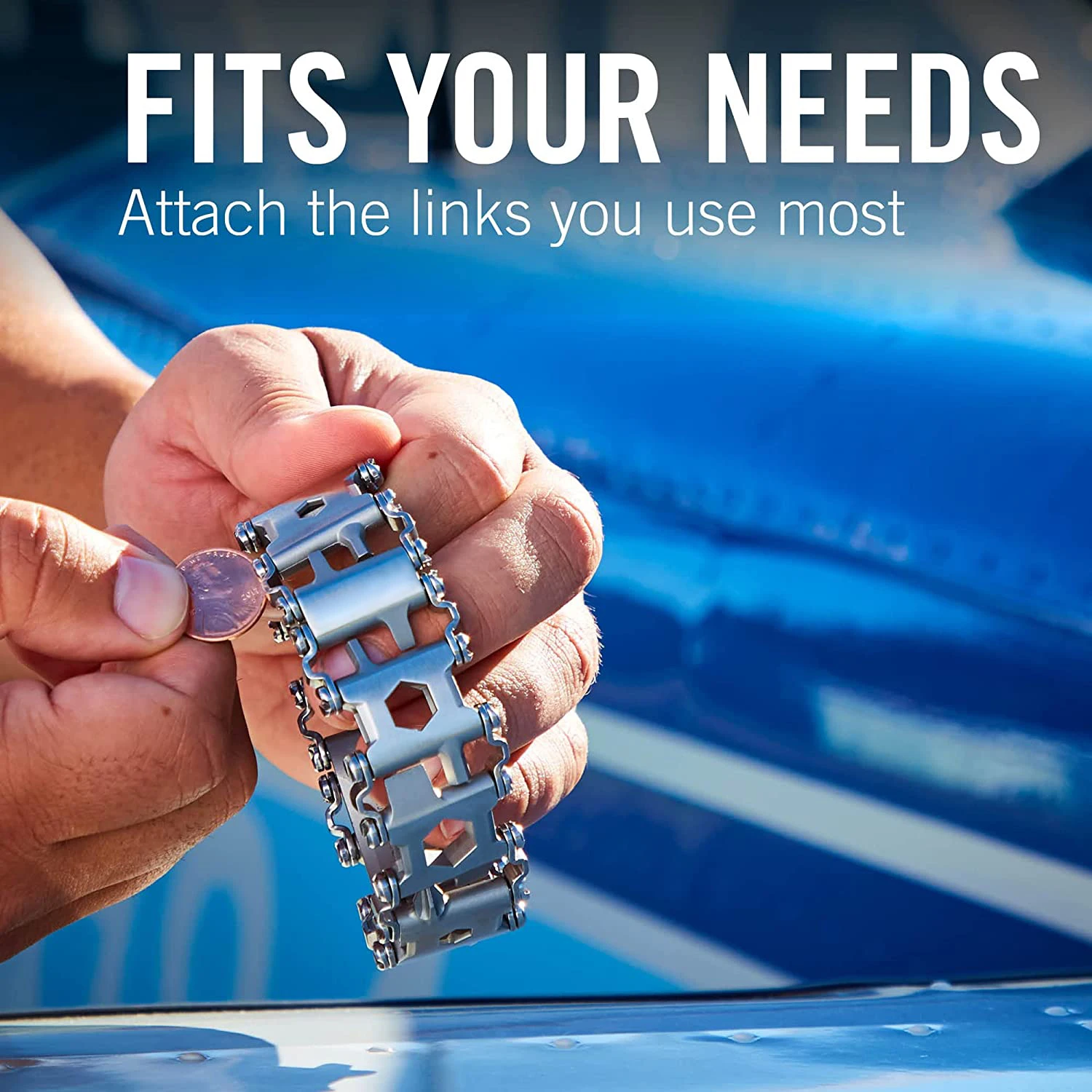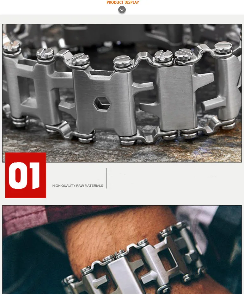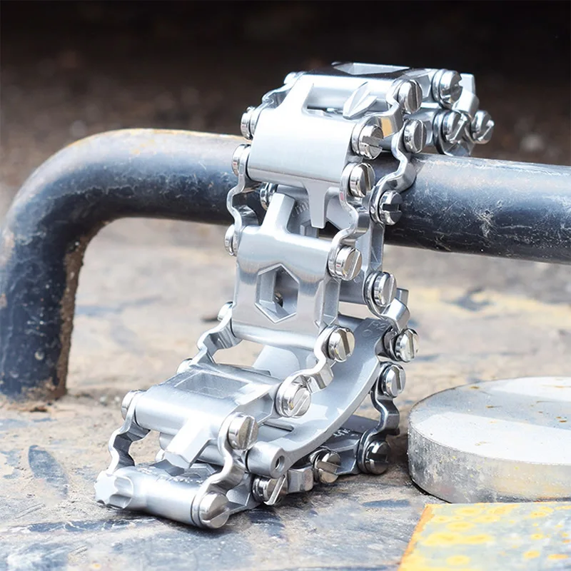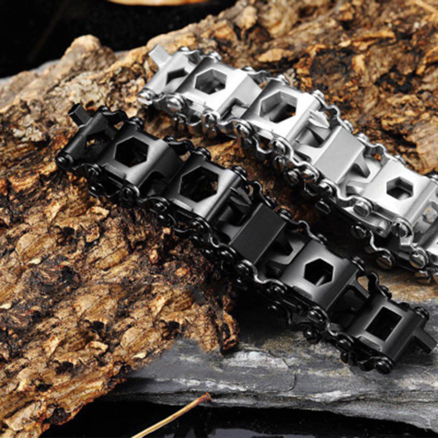 [Мульти-Функция]-это Серебряный Мульти-Функция инструмент браслет 29-в-1 чрезвычайная ситуация вне дома Функция, включая различные торцевые ключи, шестигранные ключи, дюймовый стандарт, шестиугольных отверток, крест и крестовые отвертки, гаечные ключи для кислородного бака, выключатели из карбонизированного стекла, sim-карты, переходник для отвертки и штопор. Подходит для людей, которые нуждаются в большом количестве инструментов, но не хотят носить их с собой.