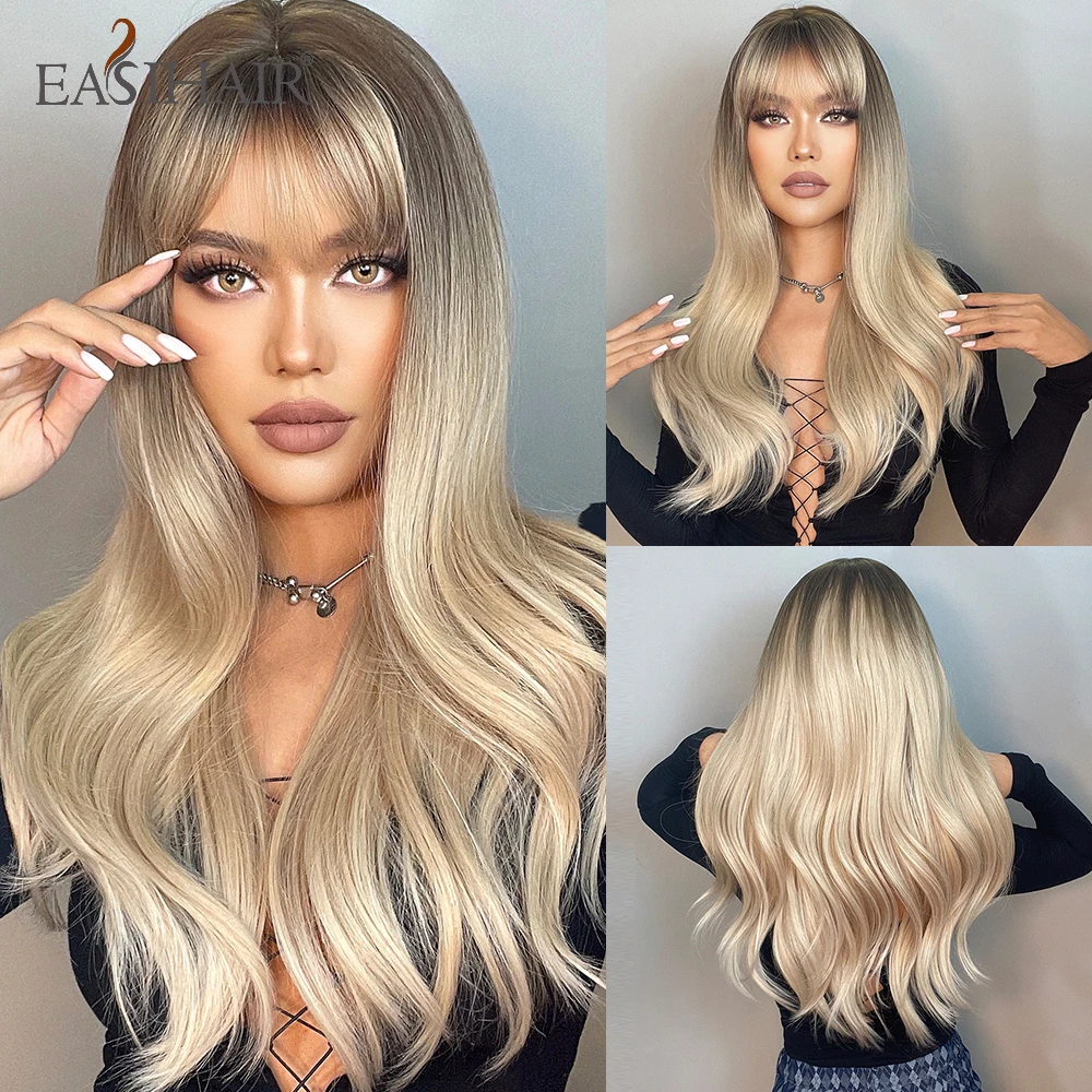 EASIHAIR Ombre серые пепельные волнистые парики с Банг светильник блонд Платина Синтетические длинные волосы для женщин Повседневные Вечерние термостойкие волокна