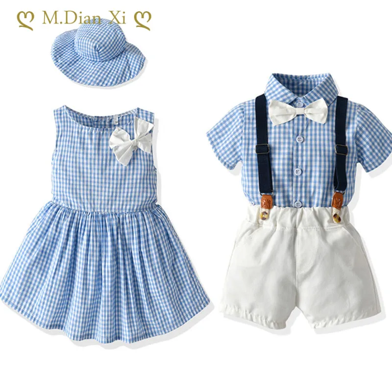 Летнее платье Brother and Sister, новинка 2022, модная клетчатая рубашка с коротким рукавом для мальчиков + шорты-комбинезон, платье в клетку для девочек + бесплатная шляпа от солнца