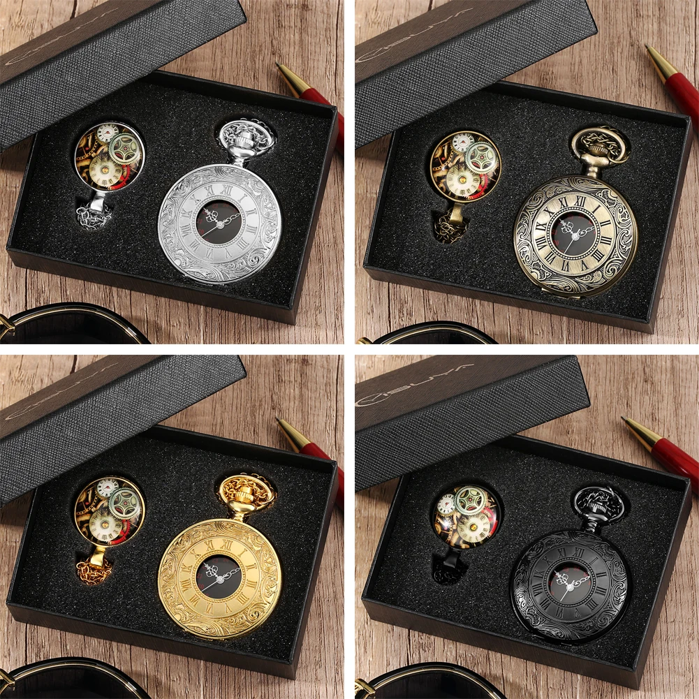 Набор винтажных кварцевых карманных часов, подарок для мужчин и женщин, ожерелье, карманные часы, классический циферблат с римскими цифрами и черным циферблатом