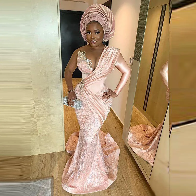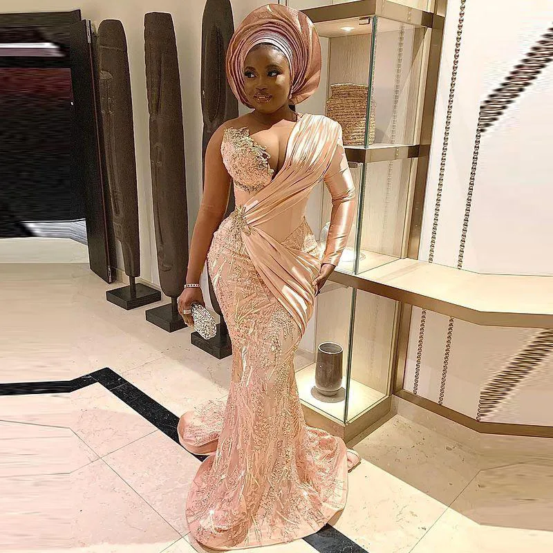 Светильник-розовое кружевное вечернее платье с прозрачными рукавами и воротником-стойкой Aso Ebi, платье для выпускного вечера с бусинами, женские вечерние платья-русалки, вечерние платья