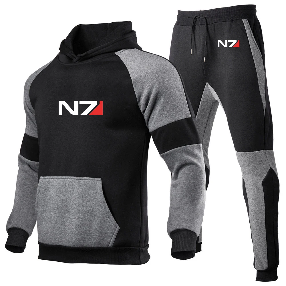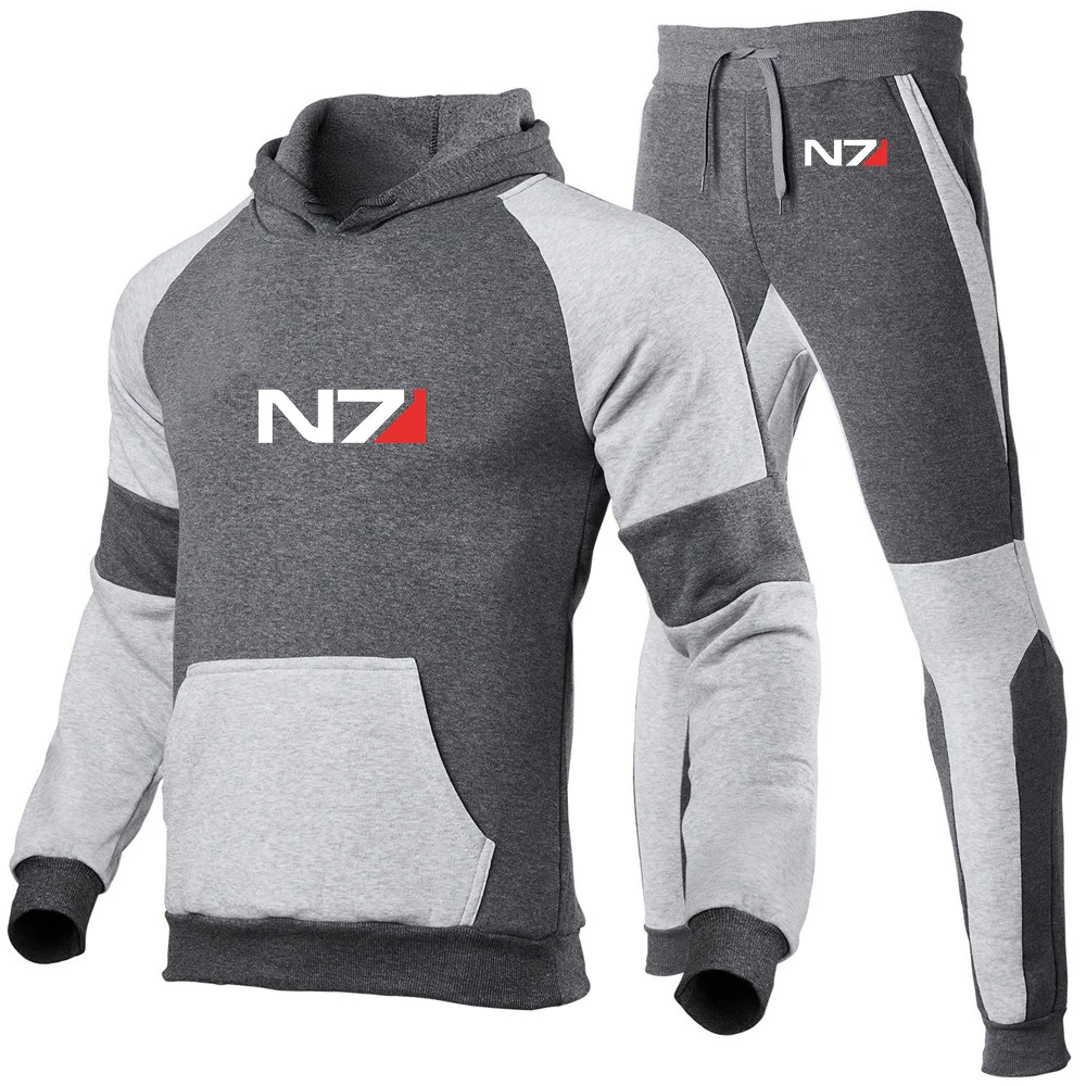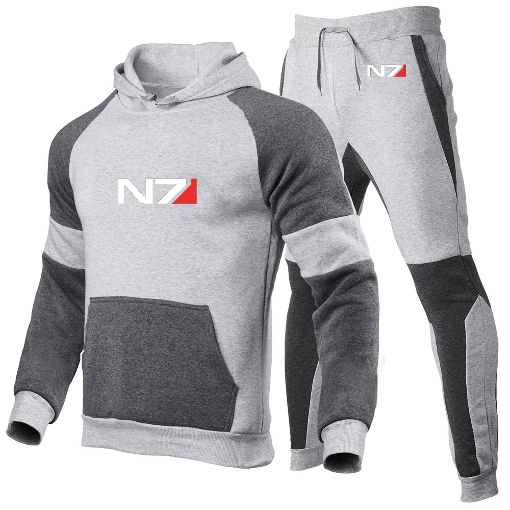 Спортивный костюм N7 мужской с принтом, Свитшот и брюки с большими карманами, контрастных цветов, толстовка, брюки с капюшоном, осень 2 шт.компл.