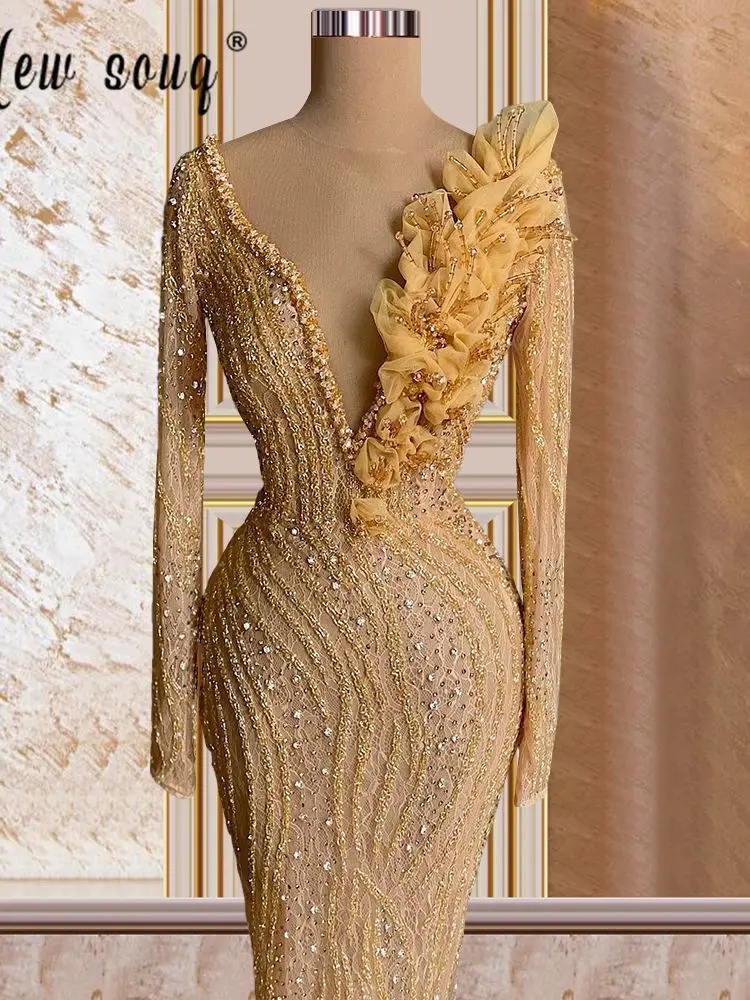Aso Ebi вечерние платья с глубоким V-образным вырезом и длинным рукавом, с бисером, блестками, Русалка, арабское вечернее платье, наряд 2022