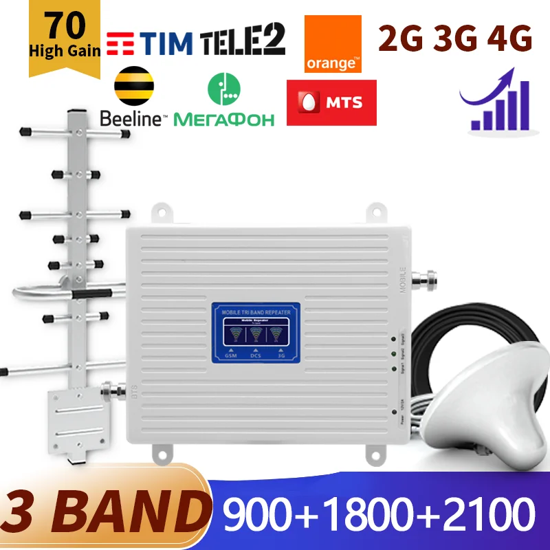 Усилитель сотовой связи трехдиапазонный 70 дБ, усилитель сигнала с высоким коэффициентом усиления и антенной 20 дБи, сетевой ретранслятор 2G 3G 4G 900 1800 2100 МГц, полный комплект