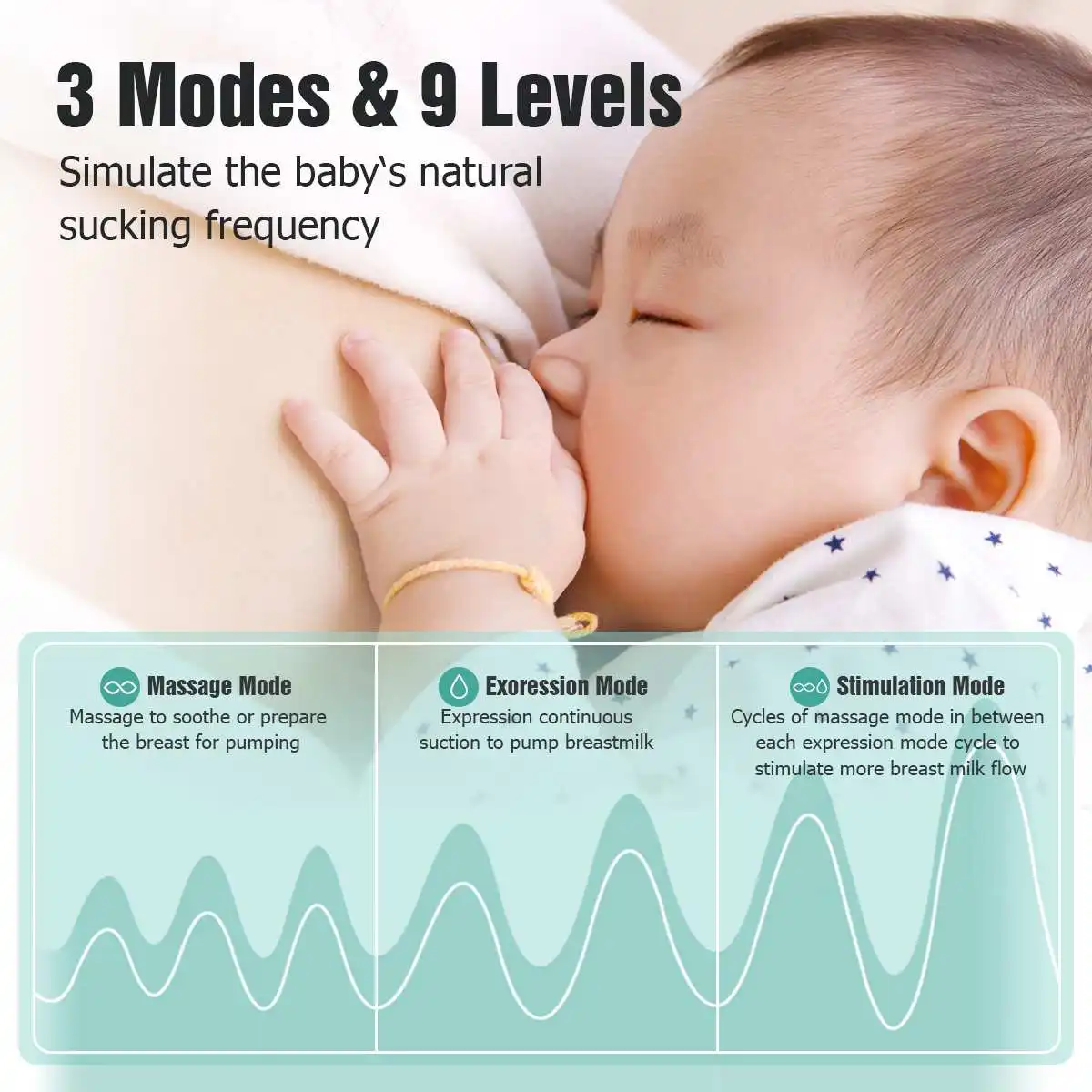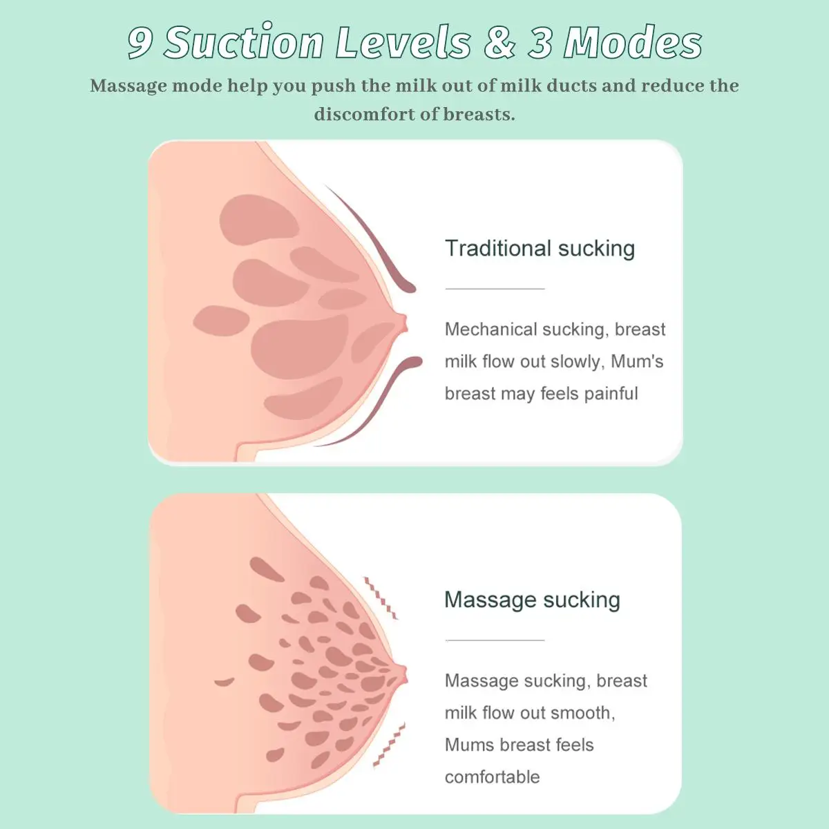 【 9 уровней всасывания и переключаемых 3 modes】с регулируемыми 9 уровнями и переключаемыми 3 режимами. Режим массажа поможет вам вытолкнуть молоко из молочных каналов и уменьшить дискомфорт груди. Чтобы помочь вам получить больше молока и дает Новой маме больше выбора и комфорта.