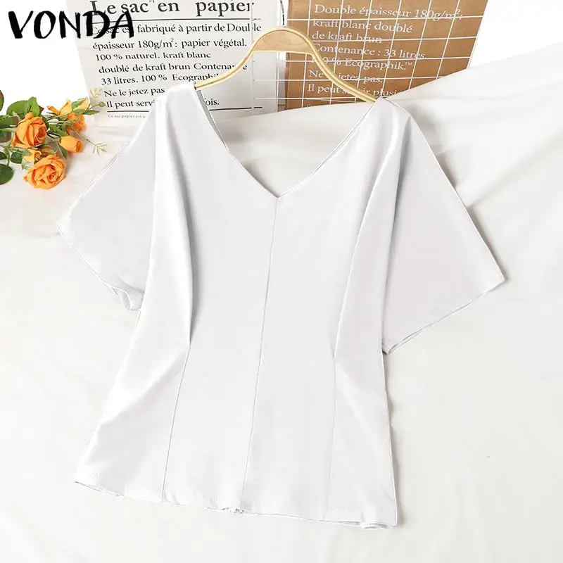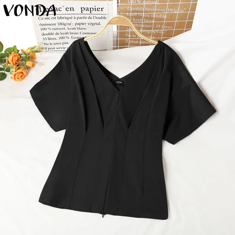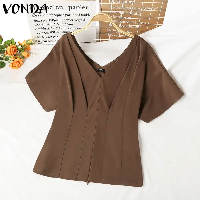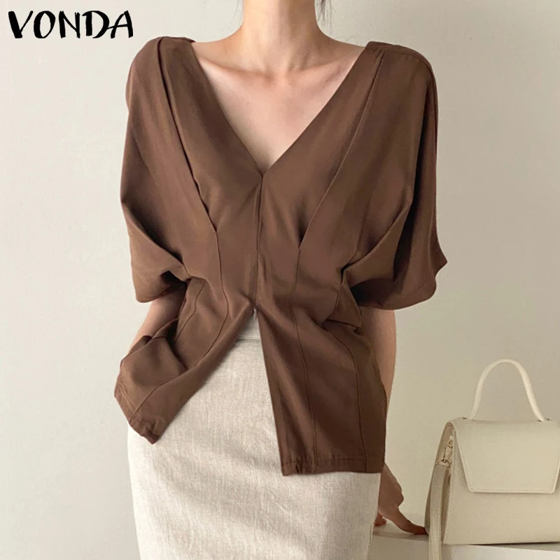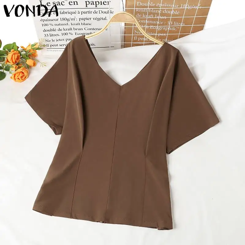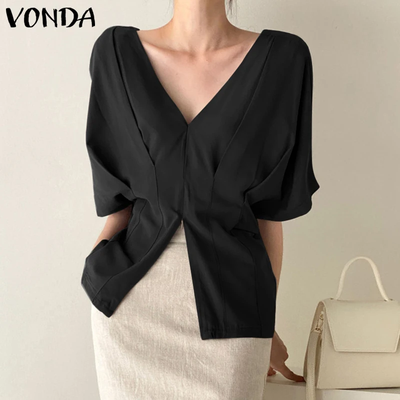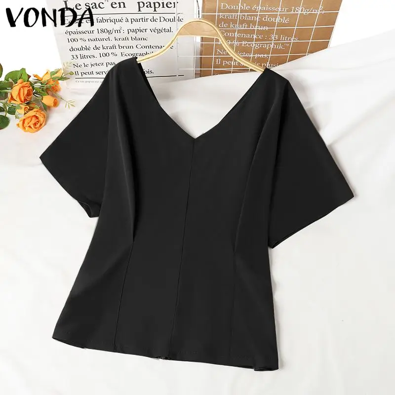 Элегантная рубашка VONDA, Женская туника, блузка 2022, Летние Женские однотонные блузы, женские блузы, сексуальный топ с V-образным вырезом и рукавом до локтя, Женский Топ
