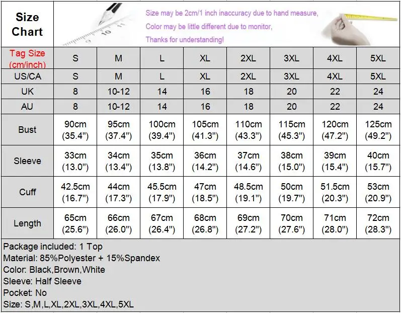 Посылка включает в себя: 1 ТопМатериал: 85% полиэстер + 15% спандексЦвет: черный, коричневый, белыйРукав: Половина рукаваКарман: нетРисунок: однотонныйОсобенности: v-образный вырезСтиль: Отдых, праздник, Европа, повседневные, модныеСезон: весна, осеньПовод: вечерние, праздничные, уличные, рабочие, путешествия, встречи, свадебные, вечерниеВнимание:1. Перед покупкой, пожалуйста, проверьте размеры в таблице размеров!2. Размер может быть неточным на 2 см/1 дюйм из-за ручного измерения, цвет может немного отличаться из-за монитора, спасибо за понимание!3. Предложение холодной воды ручная стирка. Это может помочь предметам сохранить свою форму.