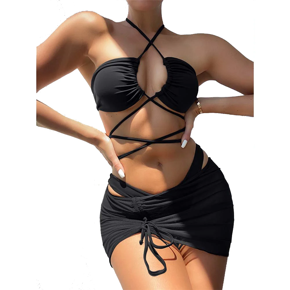 Новинка 2022, купальник из 3 частей с накидкой, сексуальный купальник с лямкой на шее, женский купальник, женский купальник из трех частей, Женский комплект бикини с пляжной юбкой