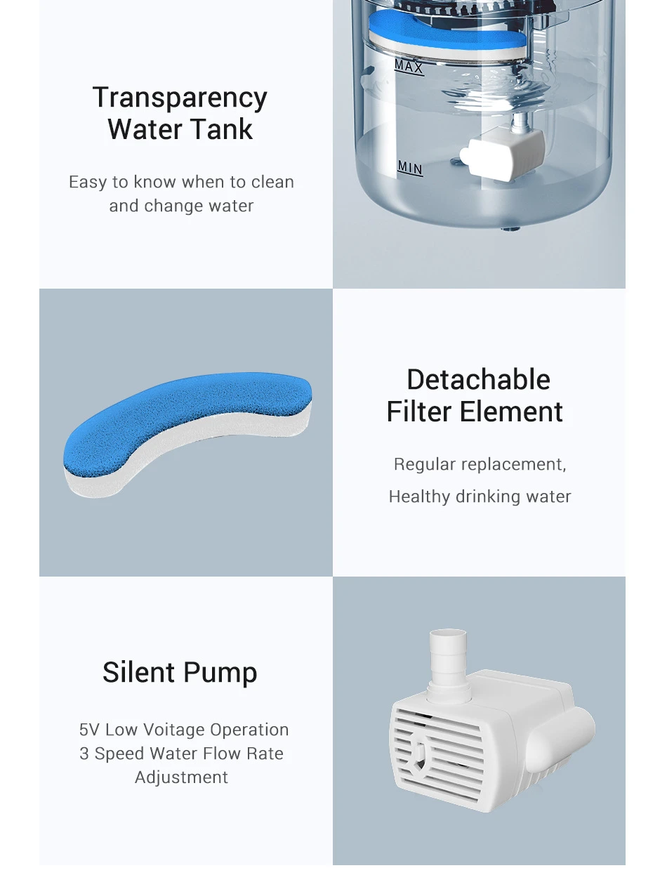 Автоматический фонтан для воды для домашних животныхПолностью прозрачный дизайн.2L большая емкость отлично подходит для собак, кошек, домашних животных.2 режима подачи воды, обеспечивая чистую проточную воду, сделайте ваших питомцев счастливее и здоровее.Спецификация продуктаМатериал: пищевой ПКЦвет изделия: полностью прозрачный (Позвольте вашим питомцам четко видеть воду)Максимальная емкость: 2 литра (67 унций)Размер изделия: прибл. 16,5x16,5x15,5/6.5x6.5x6.1in (Д * Ш * В)Вес изделия: 700 гВремя замены фильтра: один раз в месяц для достижения хорошего эффекта фильтрации. (Заменяйте фильтрующий элемент один раз в 2 месяца в режиме Интеллектуального датчика)Советы: Регулярно очищайте насос, чтобы продлить срок службыТеплые Примечания:О датчике движения, который может адсорбироваться только на глянцевой и гладкой поверхности, матовая стена или пол не отвечают условиям. (его можно адсорбировать к корпусу фонтана WF060)Стандартный комплектВсе, что вы получаете в посылка1 x фонтан для домашних животных1 x Фильтры1 x кран1 x бесшумный насос1 х адаптер (пожалуйста, выберите правильный регион)1 x Руководство пользователя1 x Оригинальная фирменная коробка