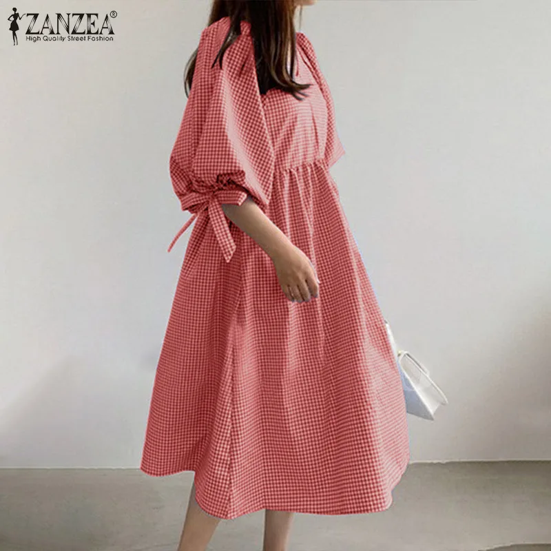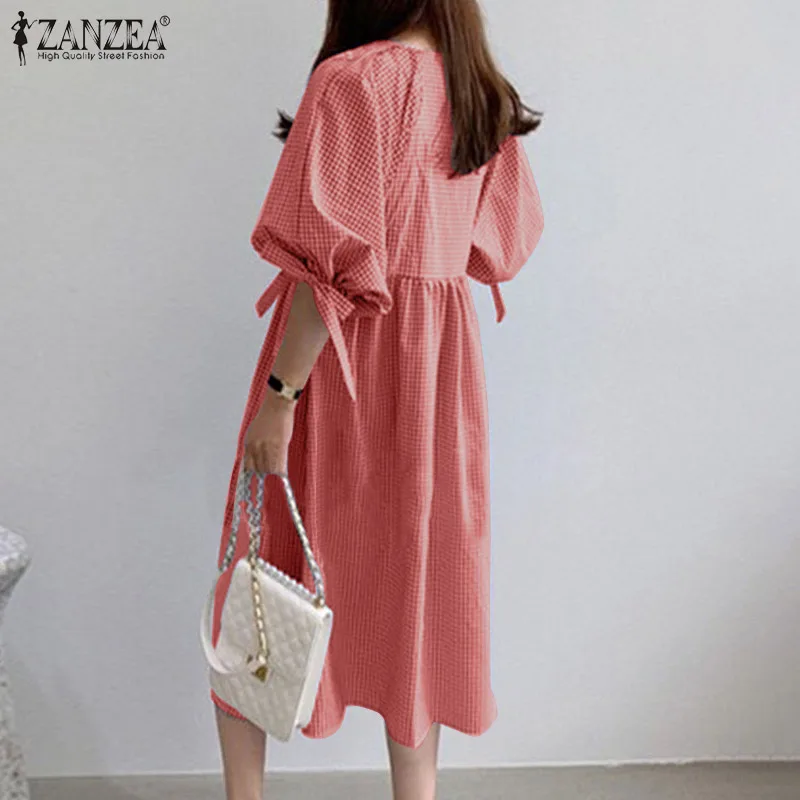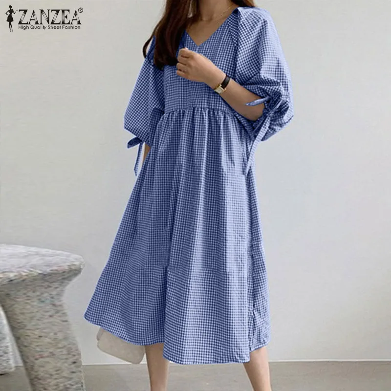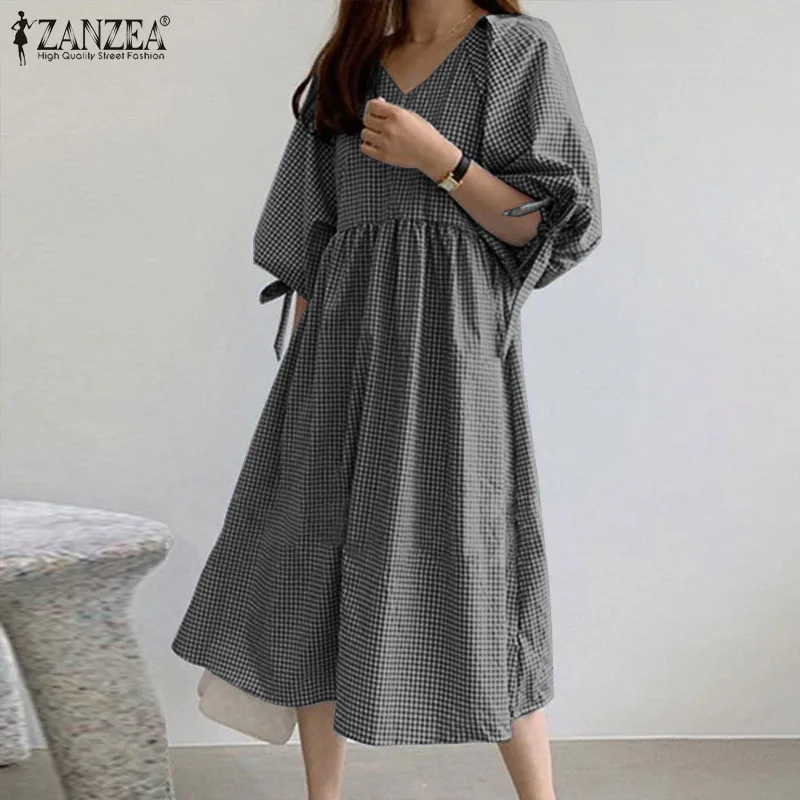 Элегантное клетчатое платье ZANZEA с принтом, женский летний сарафан, Повседневное платье до середины икры с рукавом 34, праздничное платье с V-образным вырезом, женское платье оверсайз