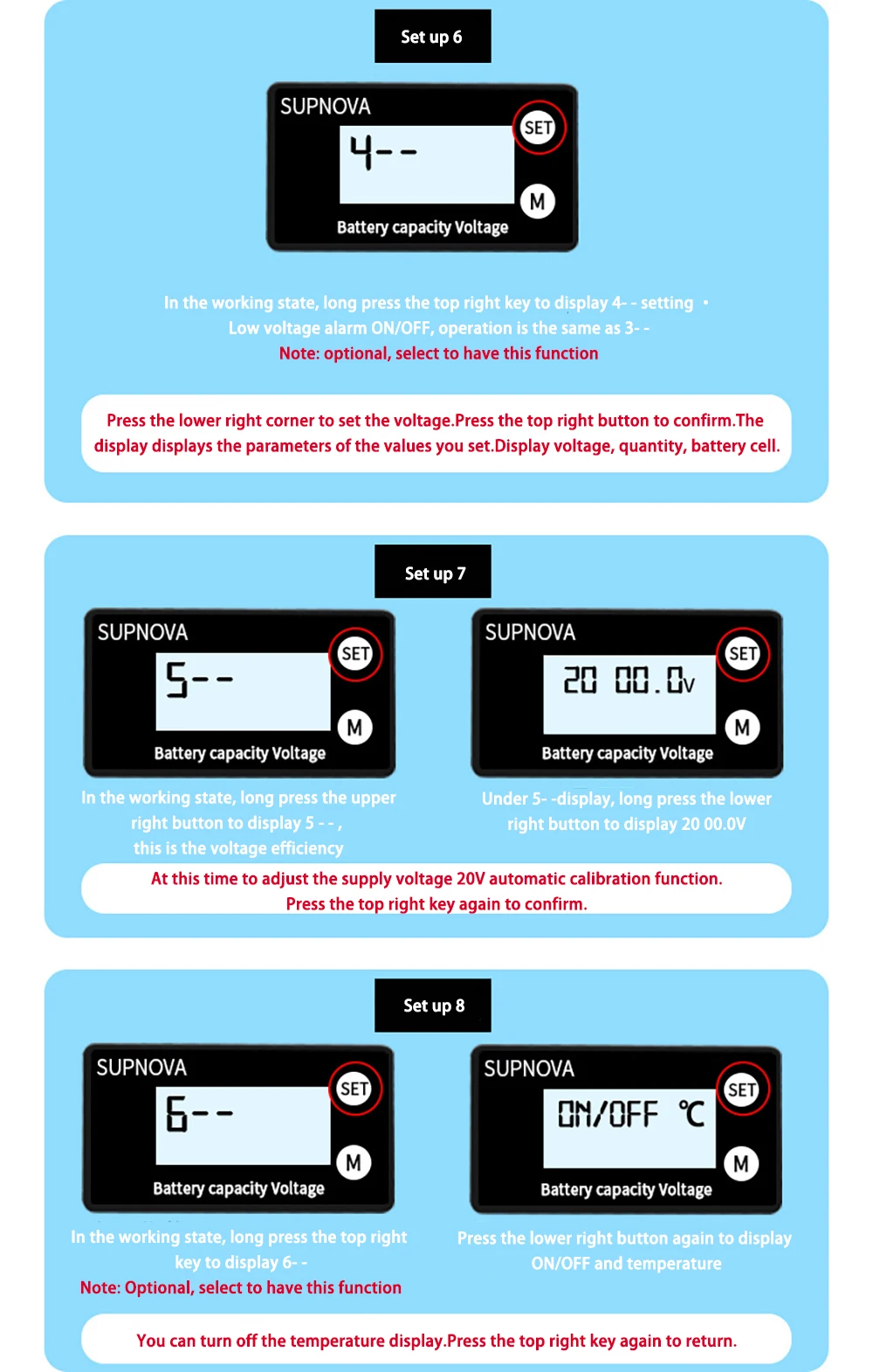 1. Тройной литиевый аккумулятор L измерение от строки L02 до 25 струн. Отключение питания с памятью.2. Свинцово-кислотная батарея P может быть от DC12V до DC24V, DC36V, DC48V, DC60V, DC72V, DC84V. Память полосы питания3. Железный литиевый аккумулятор F может измерять шнур F03 до 26 струн. Память полосы питания(Если вам нужны подробные инструкции по установке, пожалуйста, свяжитесь с нами)