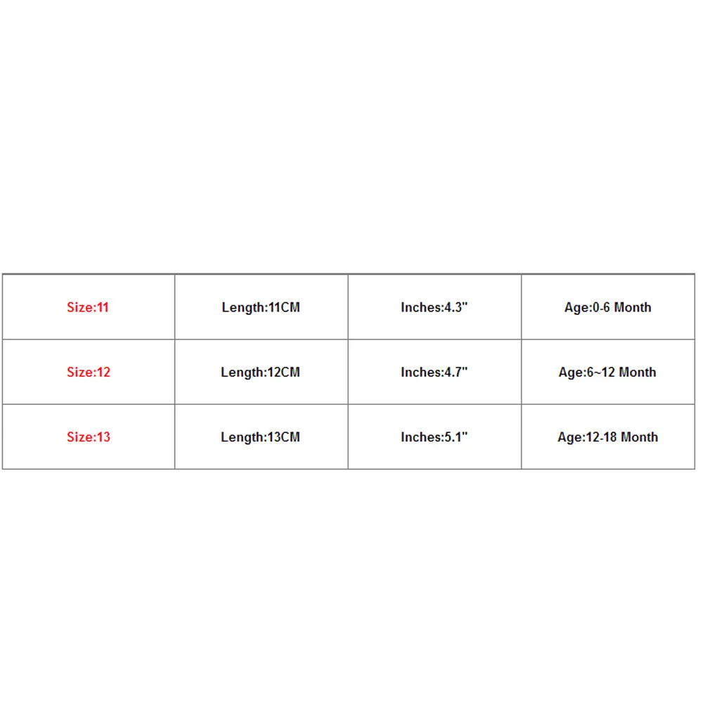 Размер: 11 Длина: 11 см Дюйм (ов): 4,3" Возраст: 0-6 Месяц Размер:12 Длина: 12 см Дюйм (ов): 4,7" Возраст: 6 ~ 12 Месяц Размер:13 Длина: 13 см Дюйм (ов): 5,1" Возраст: 12-18 Месяц