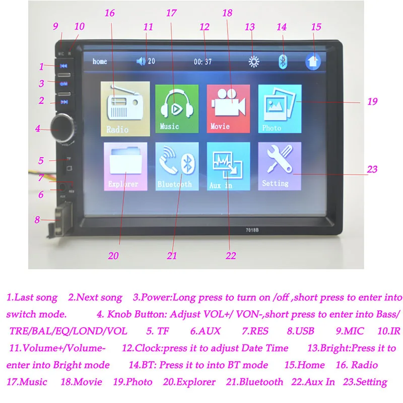 Специальные Особенности: Радио тюнер, MP3-плееры, Bluetooth, fm-передатчик, сенсорный экран, мобильный телефон