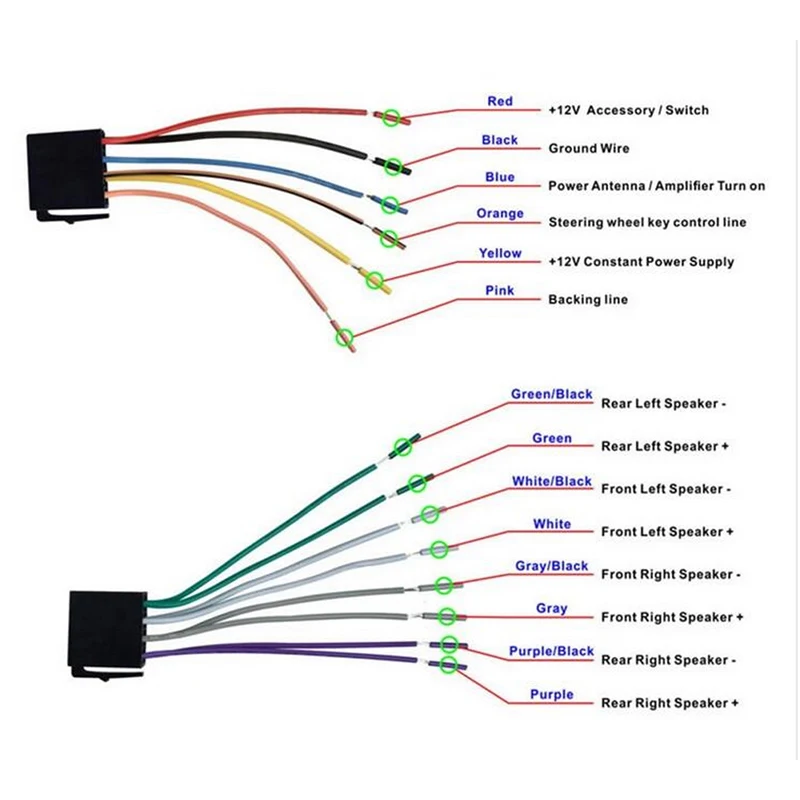 Остальные восемь проводов (серый, белый, зеленый, фиолетовый)-это акустическая линия, группа цветов, соответствующая паре линий динамиков (положительный и отрицательный).