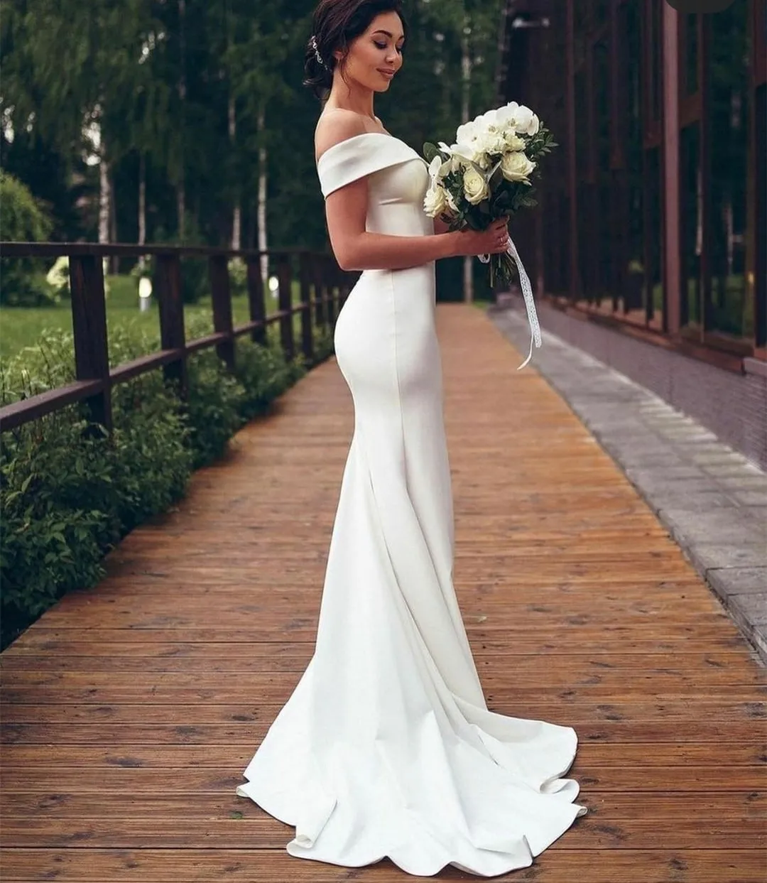 Женское длинное винтажное платье-русалка, длинное облегающее платье из крепа с открытыми плечами и шлейфом, свадебное платье