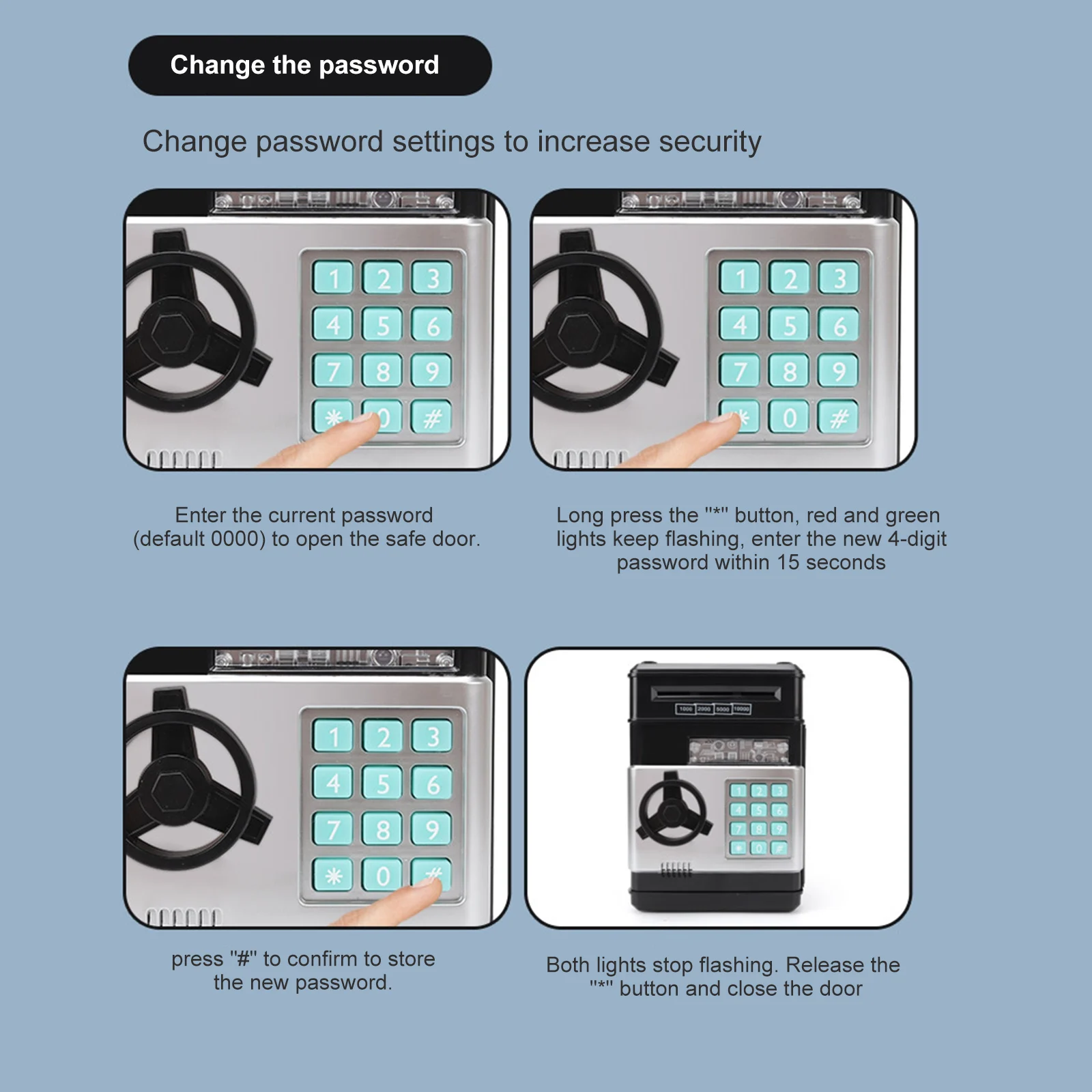 Копилка, мини-банкомат, Электронные банки для наличных денег, копилка для монет с защитой паролем, автоматическая бумажная коробка для прокрутки денег, отличные Подарочные игрушки для детей, безопасная банка для денег с музыкойХарактеристика:Выглядит как игрушка, но на самом деле это маленькое хранилище для управления финансами.Со своим собственным паролем и голосом, в дополнение к экономии денег, вы также можете установить цели экономии и план управления финансами.Можно использовать для хранения игрушек, ювелирных изделий, книг и т. д. вы можете поместить монеты в слот для монет, а также положить бумажные деньги.Способ использования: Перед использованием Установите 3 батарейки типа АА. (Не входит в комплект).Чтобы открыть его, сначала необходимо ввести четырехзначный пароль. Пароль по умолчанию: 0000. Спецификация:Материал: АБС-пластикРазмер продукта: 19.5x13.5x12.5 см/7.67x5.31x4.92inУпаковочная коробка: 20.5x14x1 4 см/8.07x5.51x5.51inЦвет: черный, розовый, красный, синий, серебристый, золотой Для использования хранилища выполните следующие действия:Введите 4-разрядный пароль и зеленый светильник будет включена. Если вы введете неправильный пароль, красный светильник включится и услышит «повторите попытку».Поверните ручку по часовой стрелке, чтобы открыть сейф плавно. Положите банкноты в отверстие банкноты. Затем нажмите пароль, чтобы вывести деньги напрямую. Когда вы закончите, закройте дверь и закройте ее. Если вы хотите изменить пароль, выполните следующие действия:Введите текущий пароль (по умолчанию 0000), чтобы открыть безопасную дверь.Нажмите и удерживайте кнопку "*", кнопка, красные и зеленые огни мигать, введите Новый 4-разрядный пароль не позднее 15 секунд, и нажмите кнопку "#" для подтверждения хранения Новинка пароль. Два фонаря перестают мигать. Отпустите ключ «*» и закройте дверь.Примечание: Если новый пароль не введен в течение 15 секунд, программа прекратится, и программа должна быть перезапущена. Примечание:В связи с различиями мониторов и эффектами освещения реальный цвет товара может немного отличаться от цвета на фотографиях. Спасибо!Возможны отклонения в 1-2 см вследствие измерений вручную.