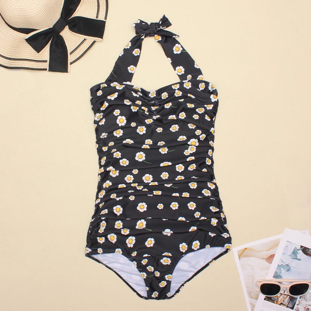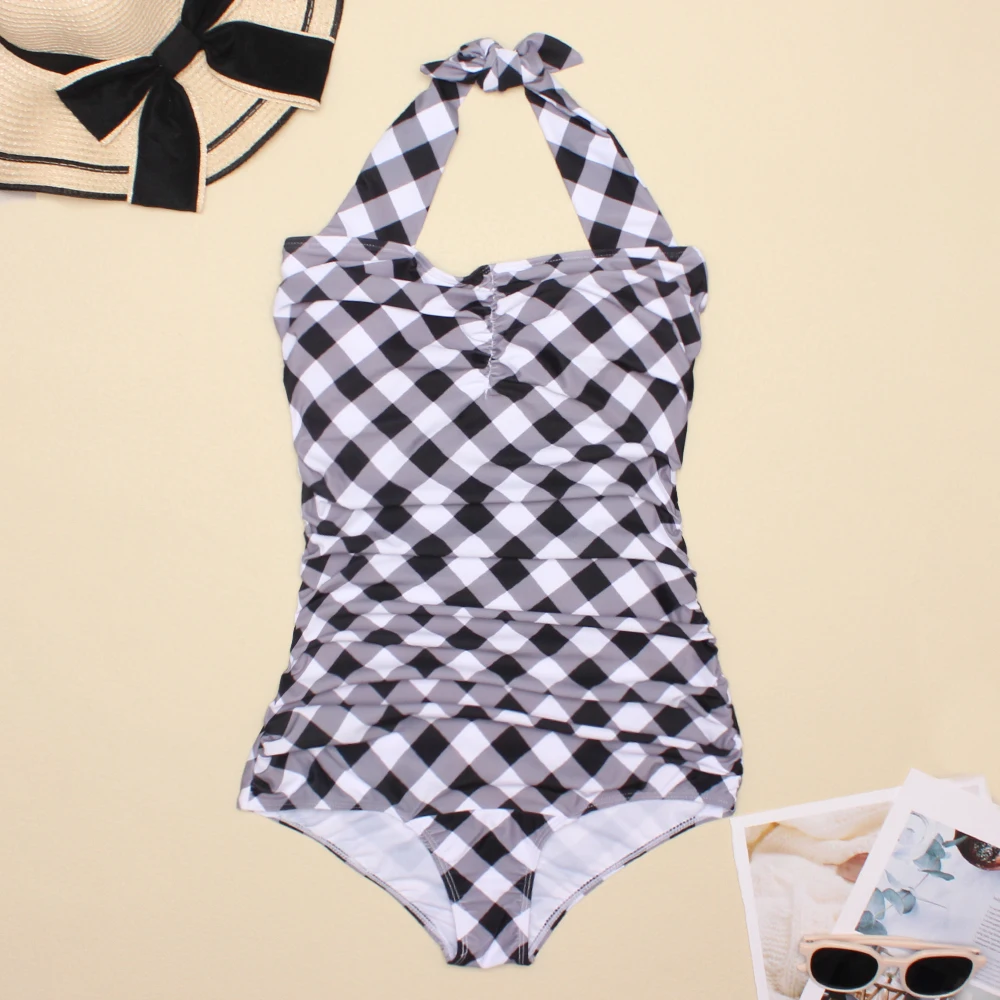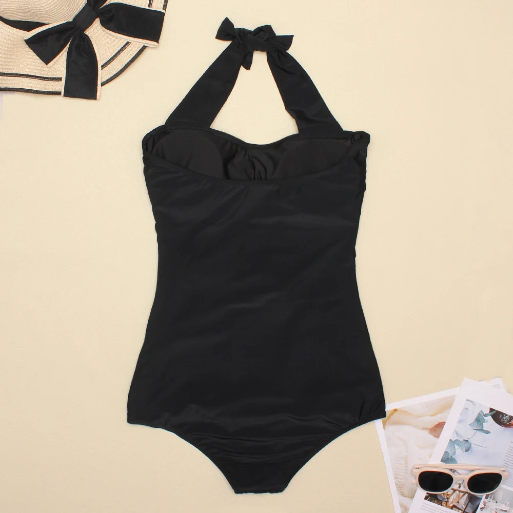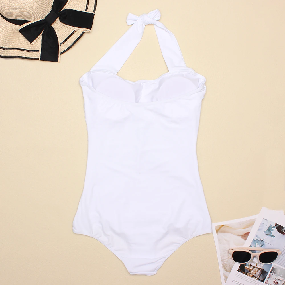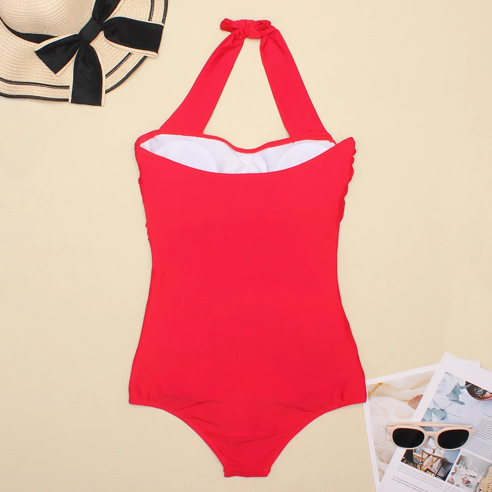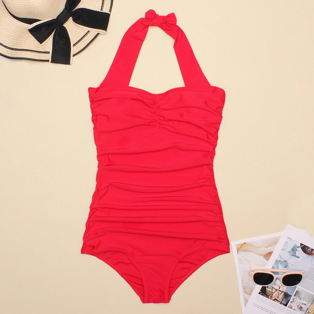Женский плиссированный купальник, красный купальник, сексуальный однотонный Цельный боди, купальный костюм с контролем живота, летняя пляжная одежда с лямкой на шее, Размеры S XXL