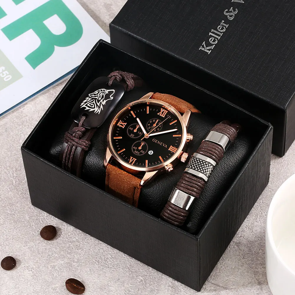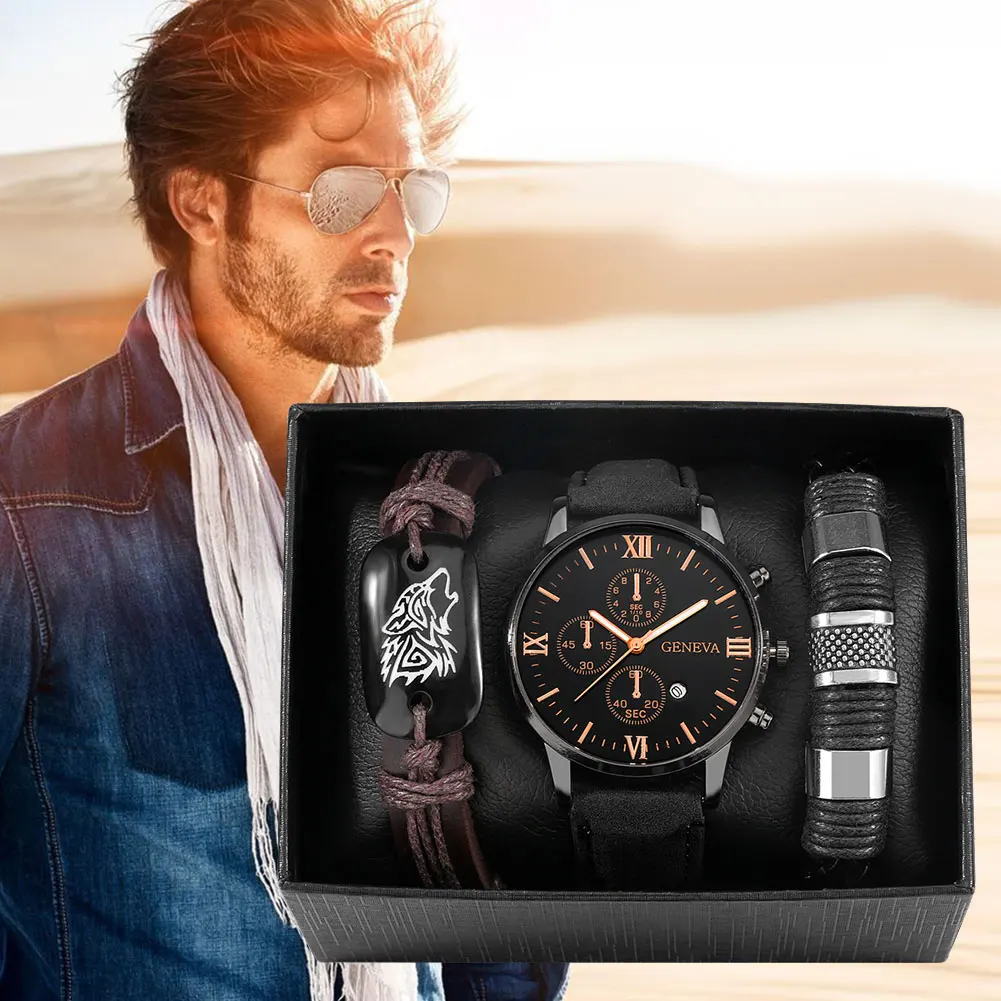 3 шт., мужские кварцевые часы с кожаным ремешком