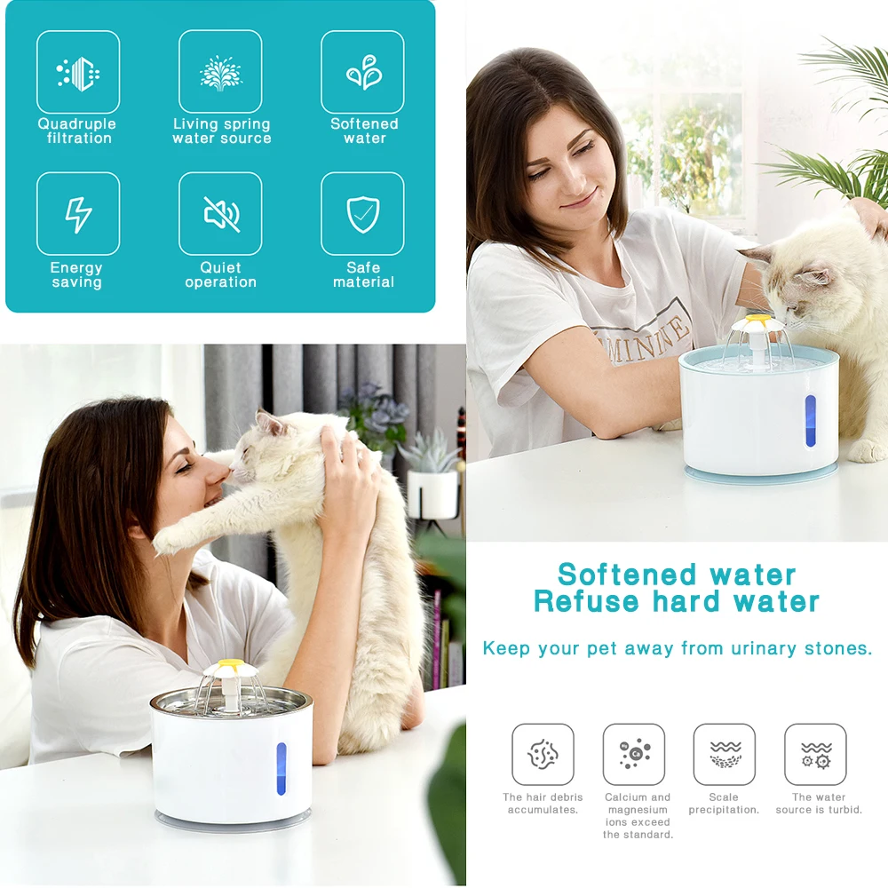 * Очистка воды: уникальный сменный дизайнерский фильтр может эффективно проникать в волосы, запах и хлор. Следовательно, фонтан может дать чистую воду для домашних животных и уменьшить риск развития болезни. Угольный фильтр помогает удалить запахи и плохой вкус.