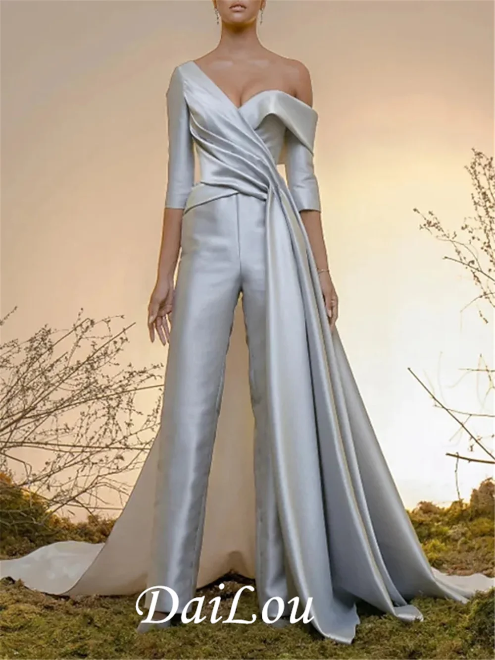 Комбинезоны минималистичное элегантное обручальное вечернее платье с открытыми плечами рукавом до локтя со шлейфом атласное со складками нарукавник 2022