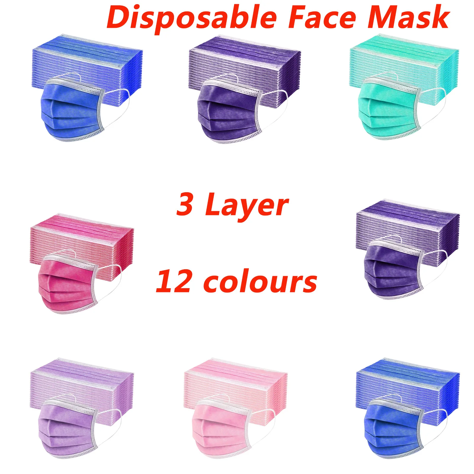 Маска одноразовая Нетканая трехслойная для взрослых, дышащая, с фильтром, фиолетовая, розовая, зеленая, 10-50 шт.