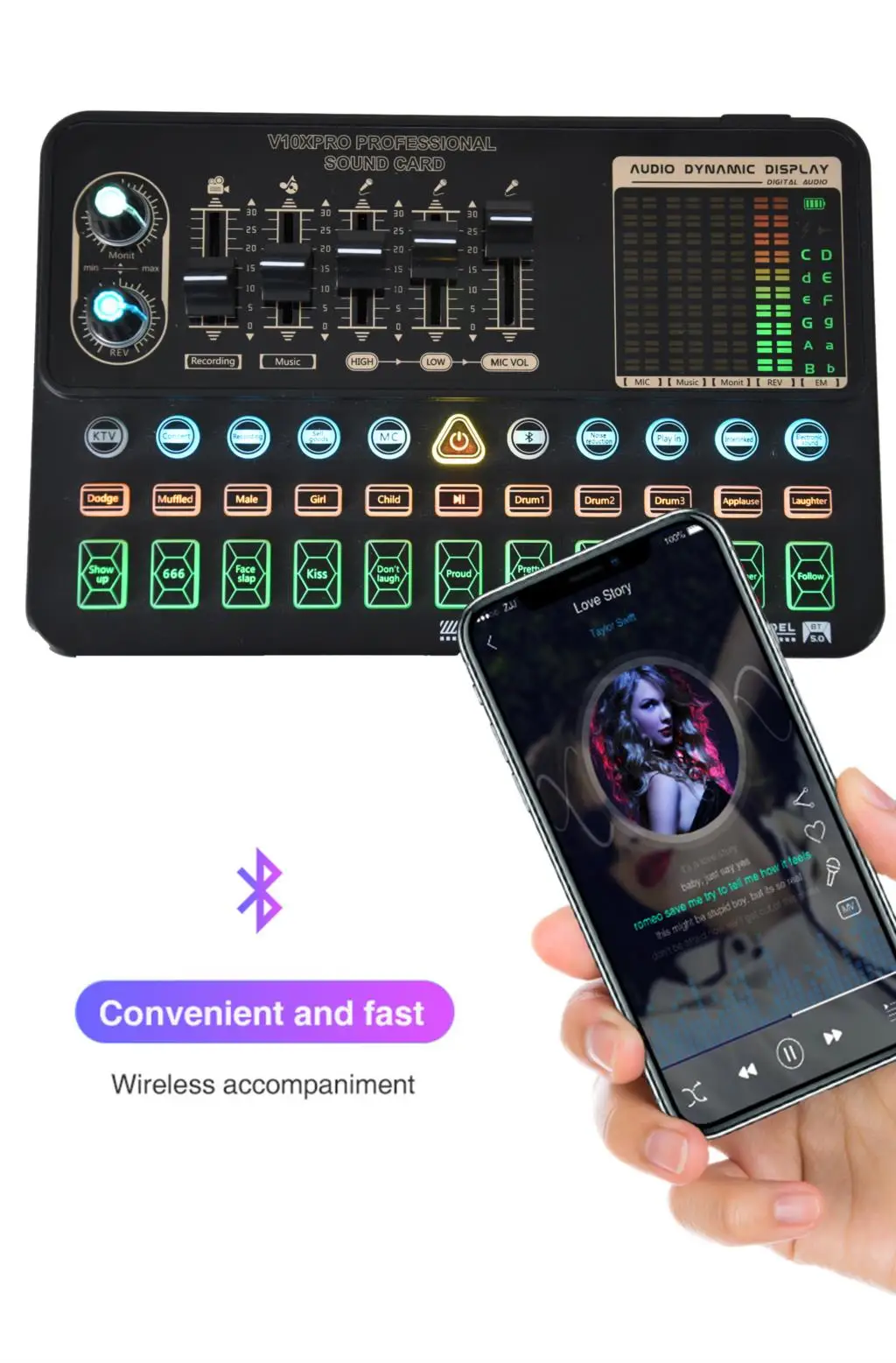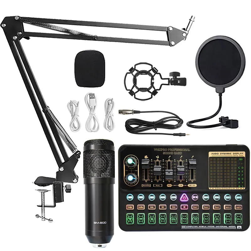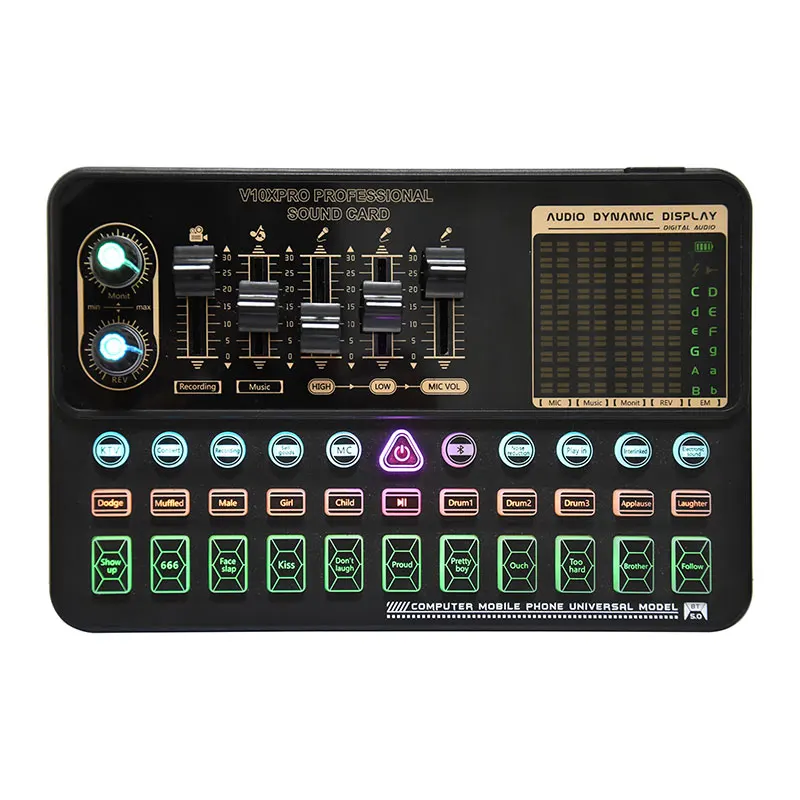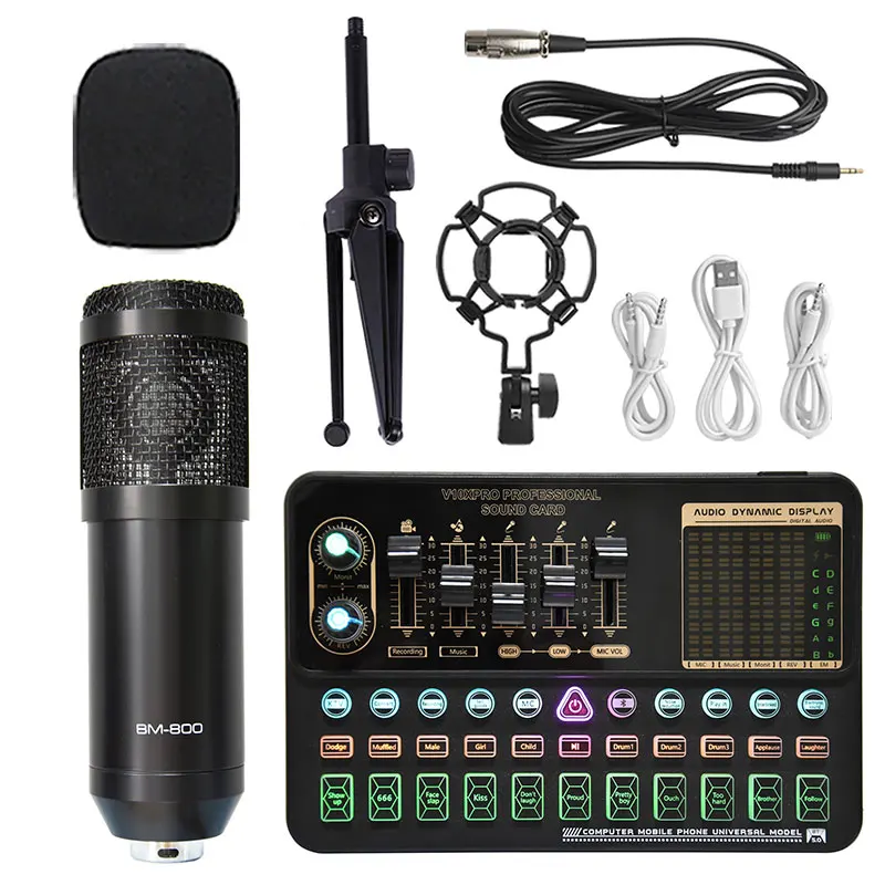 Характеристики звуковой карты V10XPRO:Функции звуковой карты:* Импорт двухъядерных чипов DSP, запись снижения качества expertisenoise* Несколько корректировок-отлично подходит для каждого Примечания* One Touch Smart шумоподавление-более четкая речь* Средняя, высокая и низкая регулировка шага* Беспроводное bluetooth-совместимое сопровождение-стабилизация, непрерывное соединение.* 12 электронных тонов-профессиональный* 16 спецэффектов настроения* Цифровая запись OTG: цифровое декодирование Android/Type-C - high-definition/Выход высокого качестваОдно касание стирания, умный/evasive.* Индикатор загорается, когда звук входит. Когда он не поет, это делает. Это дыхательная лампа.Параметры звуковой карты V10XPRO:Соотношение сигнал/шум 106 дБВыходная мощность: 600 мВтПотребляемая мощность: 5 ВтНоминальный Вход: 5 В/2 АСоотношение Аудио-шум: 16 бит/48 кГц, 90 дБОтношение шума сигнала воспроизведения: 16 бит/48 кГц, 100 дБРаспределение: 0.1% (запись), 0.005% (возврат)Емкость аккумулятора: 1200 мАчИнтерфейс: AUX, Micro-USB, Type C USBBM800 параметры микрофона:Микроядро: оригинальный F-16 ультра сейсмическая пленка capacitemicrophone картриджРежим полярности: точка сердцаЧастотная характеристика: 20 Гц-20 кГцВес микрофона: 380 гРазмер: прибл. 16x5x5 смCanon Длина: 2,5 мМатериал микрофона: стальная сетка + цинковый сплавСписок наборов V10X PRO:Звуковая карта * 1Usb-кабель для передачи данных * 13,5 мм аудио кабель * 2Микрофон * 1Держатель микрофона * 1Нейлоновый фильтр *Пластиковая Противоударная стойка * 1Насадка-губка для микрофона * 1XLR Сделано в Китае заголовок вращения 3,5 mmMeter микрофон линия * 1Руководство на английском языке * 1Оригинальность оригинальной работы проистекает из технологических инноваций!