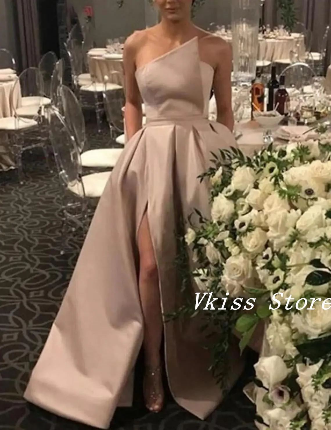 Атласное платье с одним открытым плечом, без рукавов, с разрезом