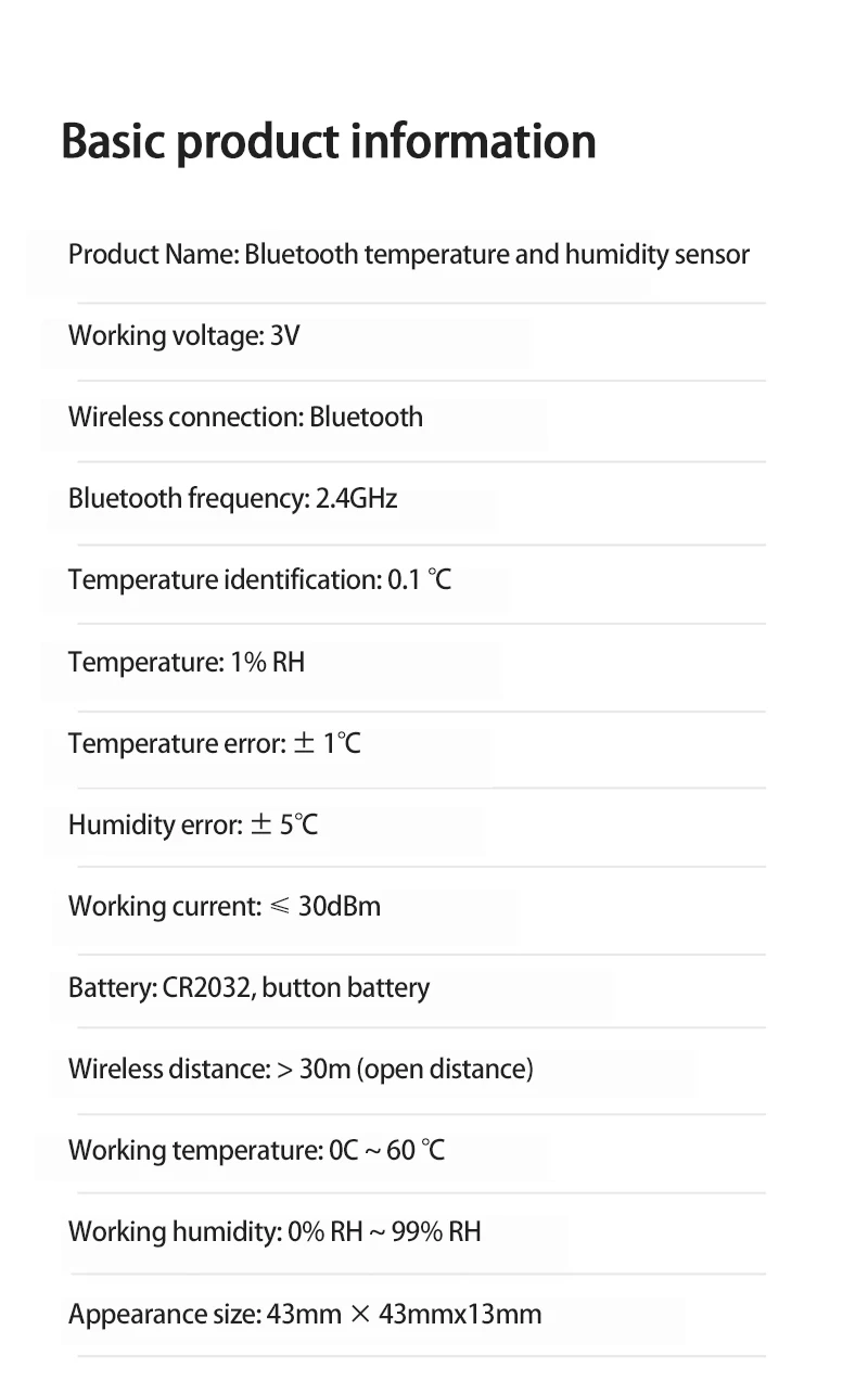 Датчик температуры и влажности Bluetooth-это устройство, которое контролирует температуру и влажность в помещении в режиме реального времени. Он использует высокоточный датчик и поддерживает беспроводное соединение Bluetooth. С помощью Bluetooth шлюза, он может удаленно смотреть температуры и влажности условий и истории температуры и влажности данных на мобильный телефон, и поддерживает детей. Интеллектуальный режим guardian может улучшить внутреннюю среду в соответствии с значением температуры и влажности и заботиться о здоровом росте ребенка. Он поддерживает приложение Tuya Smart и может использоваться в умной связи с умными кондиционерами воздуха и увлажнителями. Поддержка пользовательских названий и места установки, несколько устройств могут быть подключены к шлюзу Bluetooth в то же время, для реализации интеллектуального мониторинга всего дома, автоматического управления и управления, И дать вам больше здоровья для вашей семьи
