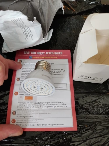 заказывала 6 ламп,оплатила 20.02.получила 11.04.2 упаковки были помяты,а одна-всмятку практически,аж контакты пробили картон и показались наружу.когда подключила,выяснилось,что она не работает.но при этом я вполне довольна,и объясню,почему: 1. продавец отправил товар дней через 6 после оплаты,и все претензии по качеству и срокам доставки - это не к нему,а к службе доставки,разумеется. 2.товар полностью соответствует описанию. 3.нерабочую лампу продавец предложил заменить,и я согласилась.получу - дополню отзыв. так что,как видите,обслуживание в этом магазине быстрое,продавец всегда готов к продуктивному,а не порожняковому общению,соотношение цены и качества товара отличное,-хотя это предварительная,конечно,оценка,ведь эксплуатация еще минимальна.но на всякий есть еще и гарантия,что тоже радует).так что 5 звезд заслужены честно, отличный магазин,рекомендую.прилагаю еще фото,они не особо удачны,но все равно расширят представления о продукте.и о том,что с ним может сделать почта)))