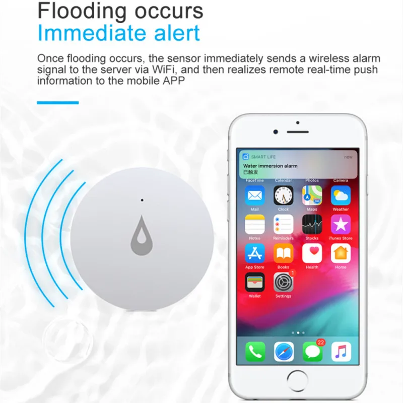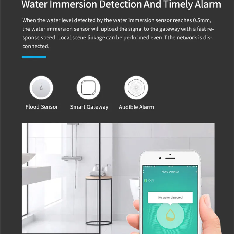 [Новое Обнаружение] принять Расширенный модуль обнаружения, в режиме реального времени датчик воды. Когда застой воды течет через два полюса зонда, сигнал тревоги будет отправлен на шлюз немедленно.