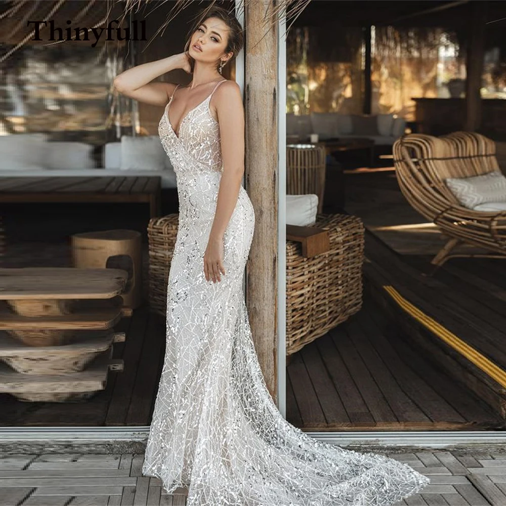 Блестящие блестящие Длинные свадебные платья в стиле бохо с V-образным вырезом, блестящие пляжные свадебные платья без рукавов с юбкой-годе, платье невесты без рукавов для страны