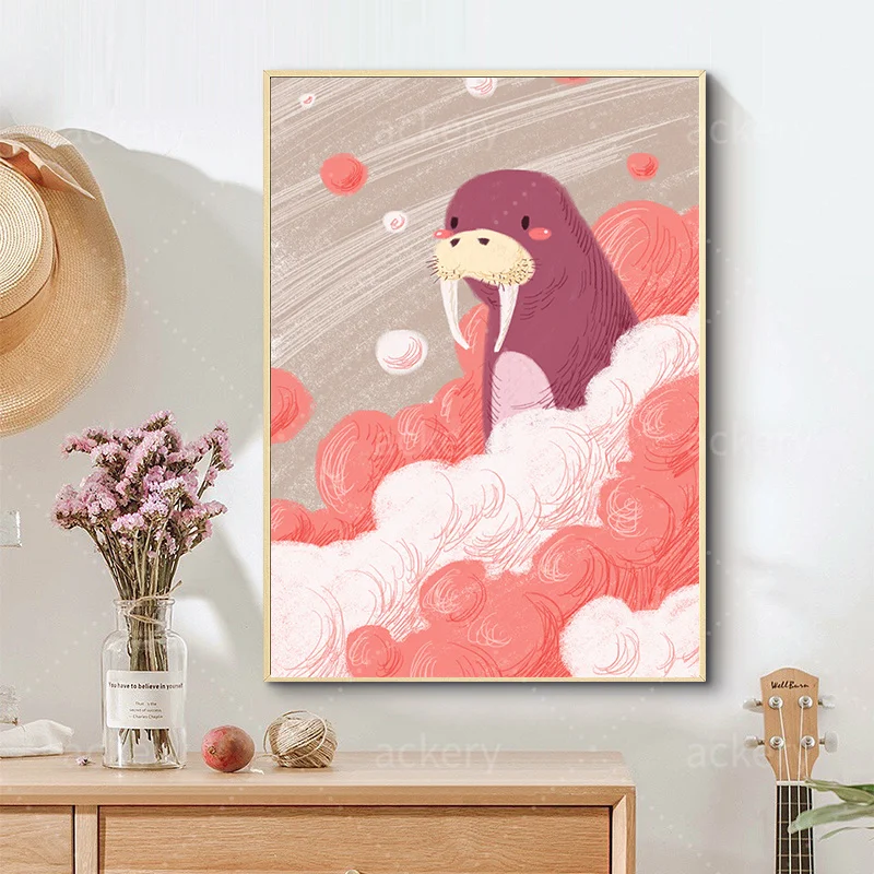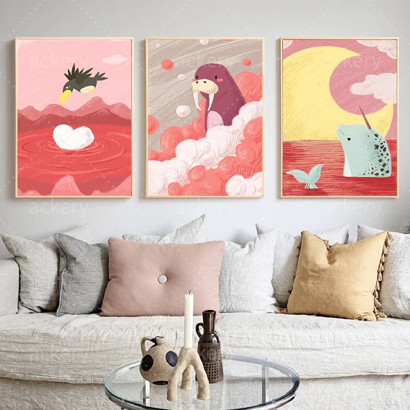 Красочные розовые Мультяшные животные кит ворона Детская комната Декор плакат скандинавский искусство холст живопись фотография