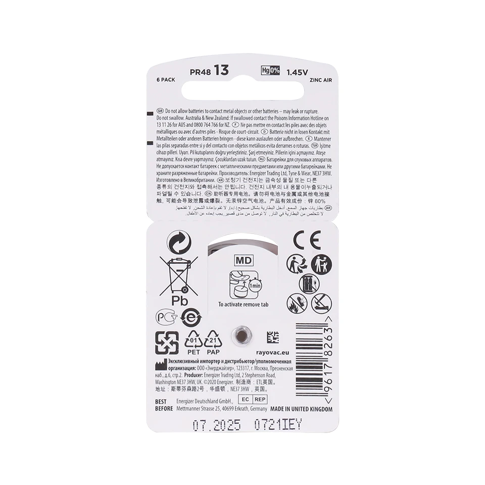 Модель: Размер 13A для слуховых аппаратов RIC/BTEФормула без ртути с высоким напряжением для быстрого запускаУлучшенный дизайн клеток, который сопротивляется отекам и утечке, обеспечивая оптимальную производительность и более последовательнуюПерфорированная посылка позволяет снять циферблат для удобной транспортировкиЭкологически чистая посылка из переработанных или перерабатываемых материалов