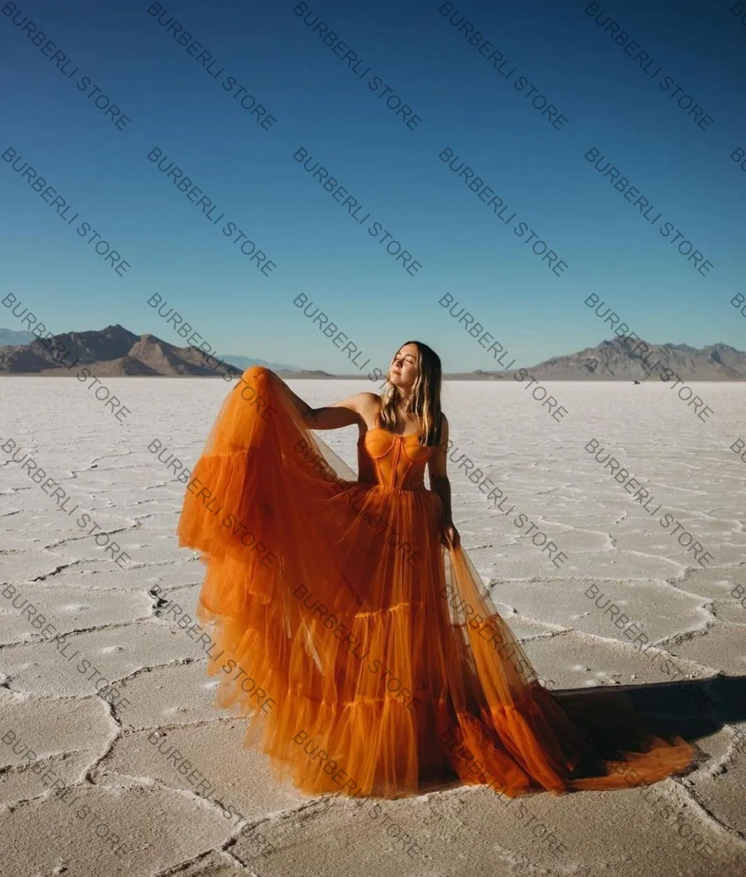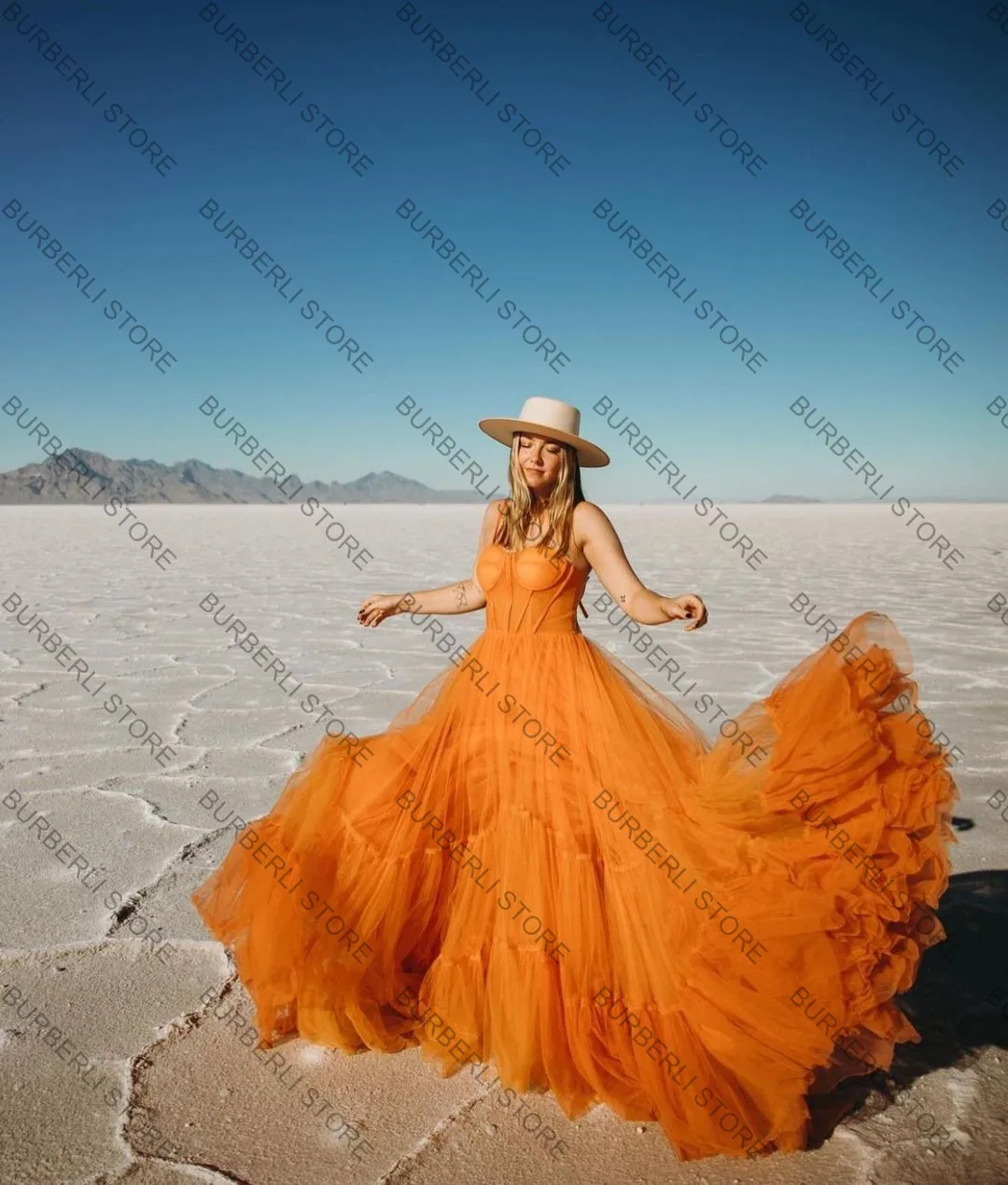 Высококачественные оранжевые тюлевые платья для выпускного вечера на тонких бретельках с оборками, пышные сетчатые вечерние платья, очень большая юбка, платье для фотосъемки