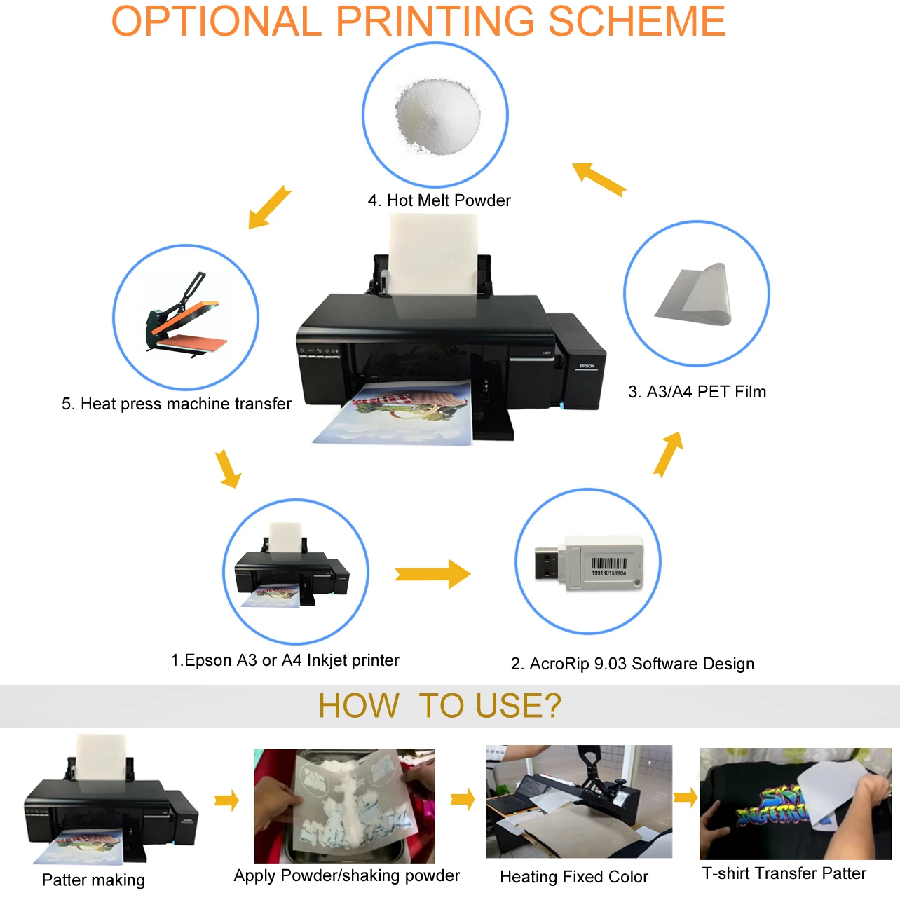 1. ändern einem Epson drucker zu DTF Drucker, oder kaufen ein DTF drucker von uns. Und bereiten Heißer Presse maschine, heizer presse blätter, Ofen, AcroRip 9,03, und verbrauchs kit (DTF Tinte, горячего расплава Pulver, PET Filme, Reiniger и т. д.)2. Программное обеспечение installieren AcroRIP:3.AcroRIP einstellung: wie tinte einstellung, dracken farbe erste und Farbe Weiß и т. Д.4. druck. Drucken farbe erste, dann weiß.5. pudern. Schütteln die pulver auf die PET film, lassen sie die hot melt pulver stick der gedruckten muster, und dann schütteln überschüssige hot melt pulver.6. trocknen und schmelzen. Setzen die film in Ofen, stellen sie die temperatur auf 140-150 ℃, backen für 3-5 minuten. Nach dem backen, überprüfen wenn die schmelzen ist gut.7. drücken. Nach der überprüfung, dass die schmelzen ist gut, die gedruckte film auf die vorbereitet T-Shirt, dann setzen one hot presse blatt auf die film dann drücken. Die heißpresse является основной продукцией в нашей компании ist 160-180 ℃, und zeit ist 10-20 секунд, Синяя рука. (über heißer drücken blätter, ВИР empfehlen mit einem тефлон Блатт, пергамент папье, заказ крафт-папье. Teflon blatt gibt Die druck eine Gloss Finish, pergament papier gibt die druck eine Semi-Gloss Finish, und kraft papier gibt die druck eine Matte Finish. )