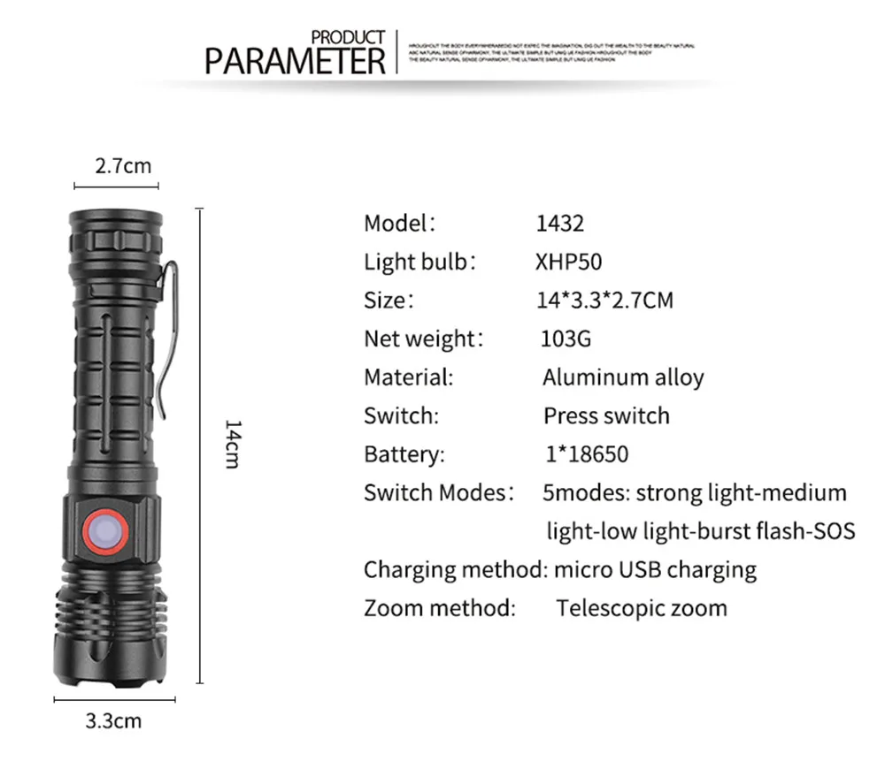 1. Бренд: TRLIFE2. Тип СВЕТОДИОДА: XHP50.23. Срок службы лампы/светодиода: 100000 часов4. 5 режимов: высокий/средний/низкий/Стробоскоп/SOS5. Тип батареи: 1 аккумулятор 18650 (Тип верхнего наконечника)6. Тип переключателя: Clicky/Clickie7. Цвет корпуса: черный8. Материал: алюминиевый сплав9. Вес нетто факела: 135 г10. Перезаряжаемый: микро USB зарядка11. Размер: 140*33*27 мм12. Метод масштабирования: телескопический зум
