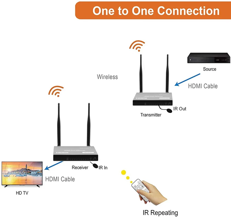 1. Наш продукт поддерживает один-в-Мульти режим сплиттера:Например, 1 TX (передатчик) соответствует до4RX (приемники) Также поддерживает режим «мульти-к-одному»: например,4 передатчика соответствуют 1 приемнику 2. Наша продукция поддерживает usb-клавиатуру, мышь, более удобна Внимание: 1. Что касается функции IR, работает только в режиме one-to-one 2. Пожалуйста, обратите внимание: Tx и RX необходимо использовать в паре, TX и RX не могут использоваться отдельно. 3.Usb-порт предназначен только для usb-мыши или клавиатуры, не может использоваться для других устройств Этот беспроводной адаптер HDMI предоставит вам возможность беспроводной передачи аудио и видео высокой четкости, Который может удаленно передавать аудио и видео HDMI на дисплеи высокой четкости, такие как телевизор/ Проектор/дисплей. Этот продукт принимает стандартный протокол беспроводной передачи, который имеет быструю скорость передачи И сильная способность анти-помех. TX поддерживает локальную петлю HDMI; Он также поддерживает инфракрасный пульт дистанционного управления для Расширенные приложения, подходят для конференций, тренировок, образования, домашних развлечений и других приложений. 1. Этот продукт поддерживает до 200 метров без передачи препятствий; До 164 футов (50 м) через стену (Пожалуйста, обратите внимание, что расстояние, количество препятствий, Матиры, толщина и т. д. все это влияет на использование эффекта, если используется через препятствия, эффект использования зависит от В реальной ситуации. Потому что это зависит от многих факторов, если это возможно, мы советуем вам использовать его в открытом пространстве). 2. Передатчик поддерживает локальную петлю HDMI, чтобы облегчить мониторинг источника видео. 3. Поддержка разрешения to1920x1080P @ 60 Гц. Совместимость с различными устройствами HDMI 4. Принимает Международный 2,4 ГГц/5 ГГц двухчастотныйБеспроводная связьСигнал передачи, быстрая скорость передачи и Сильная способность анти-помех. 5.Максимальное входное/выходное расстояние HDMI: менее 5 метров, разрешение 1920X1080P @ 60 Гц Посылка (для 1 комплекта): Передатчик HDMI TX * 1 HDMI приемник RX * 1 Двухдиапазонная Антенна 2,4G/5G * 4 12 В постоянного тока адаптер питания * 2 Инфракрасный излучатель кабель * 1 Инфракрасный кабель приемника * 1 Руководство по эксплуатации * 1