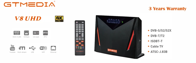 1. Android 9.0 TV BOX + DVB-S/S2/S2X,DVB + T/T2/Cable/ATSC-C(J.83B)/ISDBT, AVS +HEVC main 10 profile(10 бит),AUTO BISS,T2MI,GTFeeds,YUV422,Gtshare"2. Amlogic S905X3 2GBRAM + 16GBROM3. Поддержка 4K ультра-высокой четкости дисплея и декодера, двухъядерный процессор MIPS75Kf;4. Поддержка Unicable, DiSEqC1.0/1,1/1,2/USALS мотор полностью поддерживает;5. Поддержка полного ключа PowerVu, DRE & Biss; AUTO BISS6. Встроенный Wifi 2,4G/5G + BT4.1, 802.1.1b/g/n/ac7. Система является GT UI, GTStore Addons предустановленной.Netflix, Youtube, Prime-Video, Disney Plus, онлайн-фильмы и т. Д.Поддержка SAT2 IP, GTshare APP"8. Поддержка IPTV на GTPlayer,9. Поддержка CCCAM, NEWCAM, MGCAM и CA декодирование карт;10. Веб-сайт технической поддержки: www.freesat.cn
