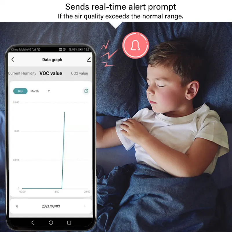 2. После подключения к приложению, он может быть связан с различными продуктами smart home. Например, при обнаружении чрезмерного формальдегида/Лос умный очиститель воздуха автоматически включается; Когда превышен углекислый газ, Умный вентилятор свежего воздуха автоматически включается; Когда температура ненормальная, температура кондиционера автоматически регулируется; Когда влажность слишком низкая или слишком высокая, Смарт-увлажнитель будет включаться/выключаться автоматически; Когда определённый параметр будет обнаружен, чтобы превысить стандарт, на будильник будет отправлено сообщение (вышеуказанная функция умной связи должна быть совместима с продуктом smart home)