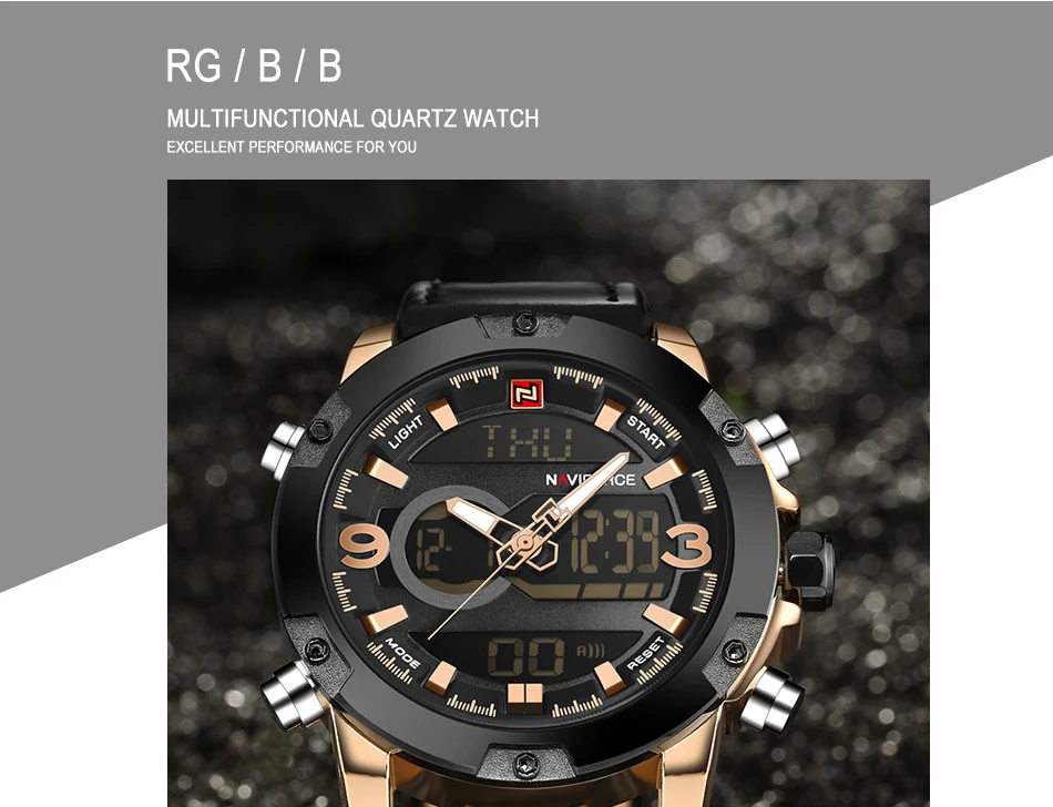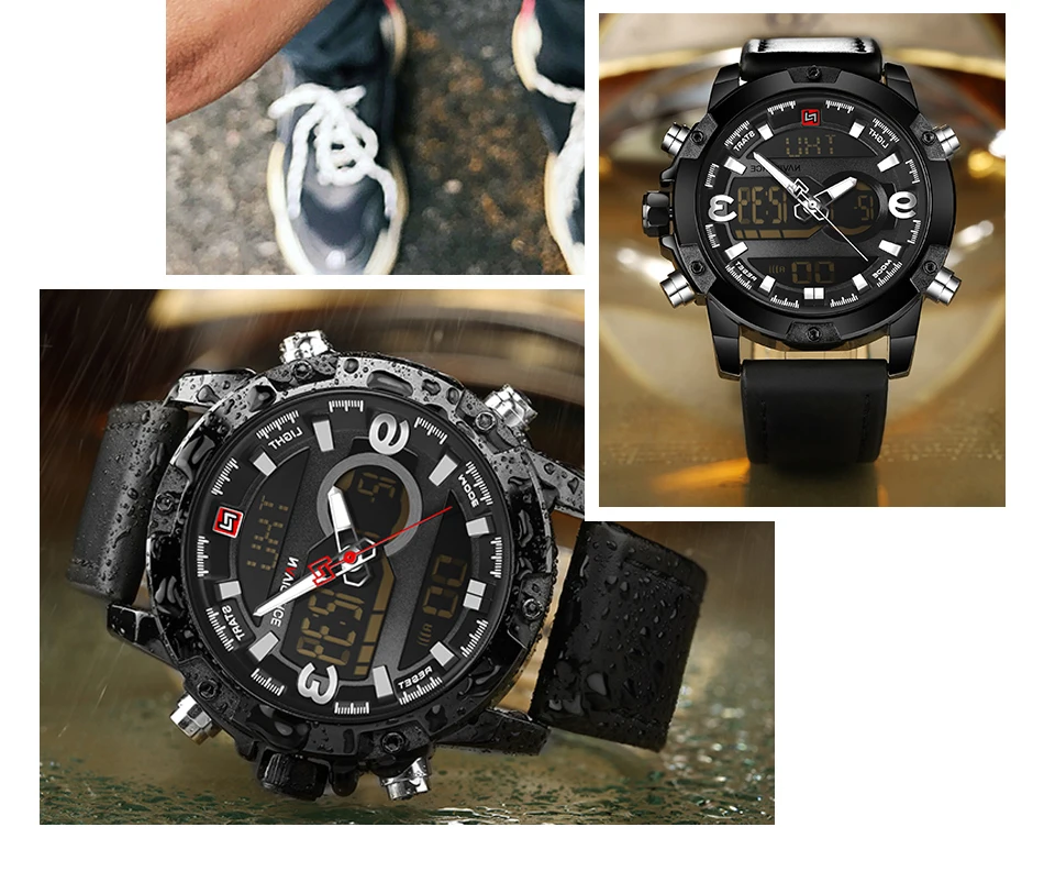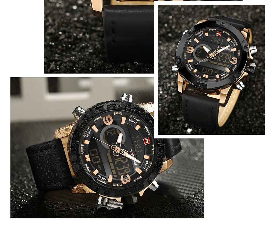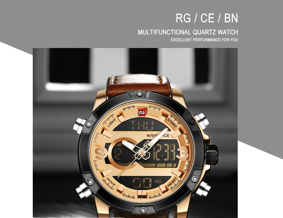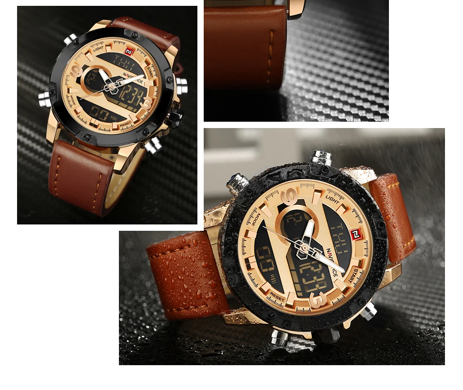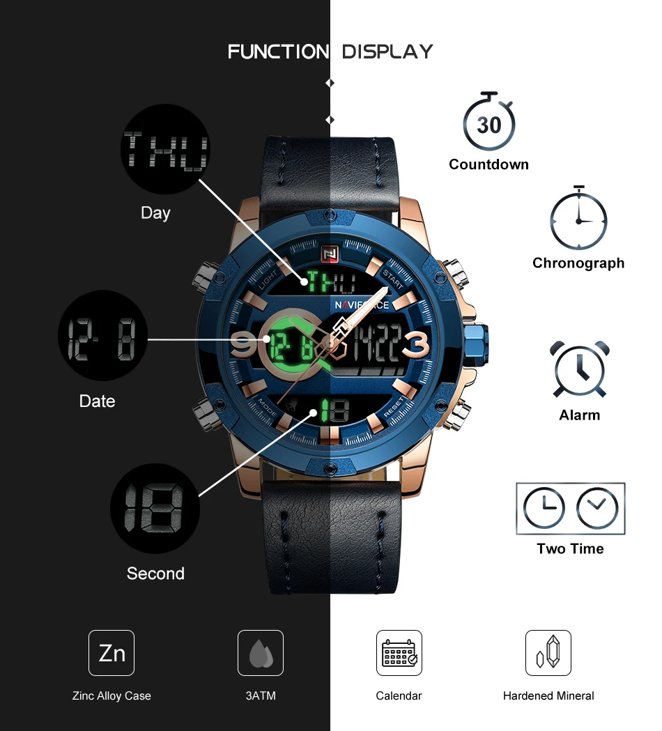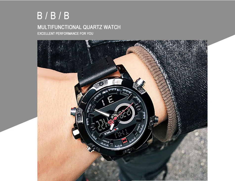 Механизм: кварцевый механизм + светодиодный дисплейПол: мужчин и женщинСтиль: Модный, Повседневный, СпортивныйМатериал циферблата: закалённое минеральное стеклоМатериал ремешка: кожаный ремешокТип застежки: ПряжкаДиаметр циферблата: 46 ммЧехол Толщина: 16 ммОбщая длина: 245 ммШирина ремешка: 24 ммВес изделия: 106 гХарактеристики: Водонепроницаемость до 30 м, отображение дня и даты, светящийся, хронограф, обратный отсчет, будильник