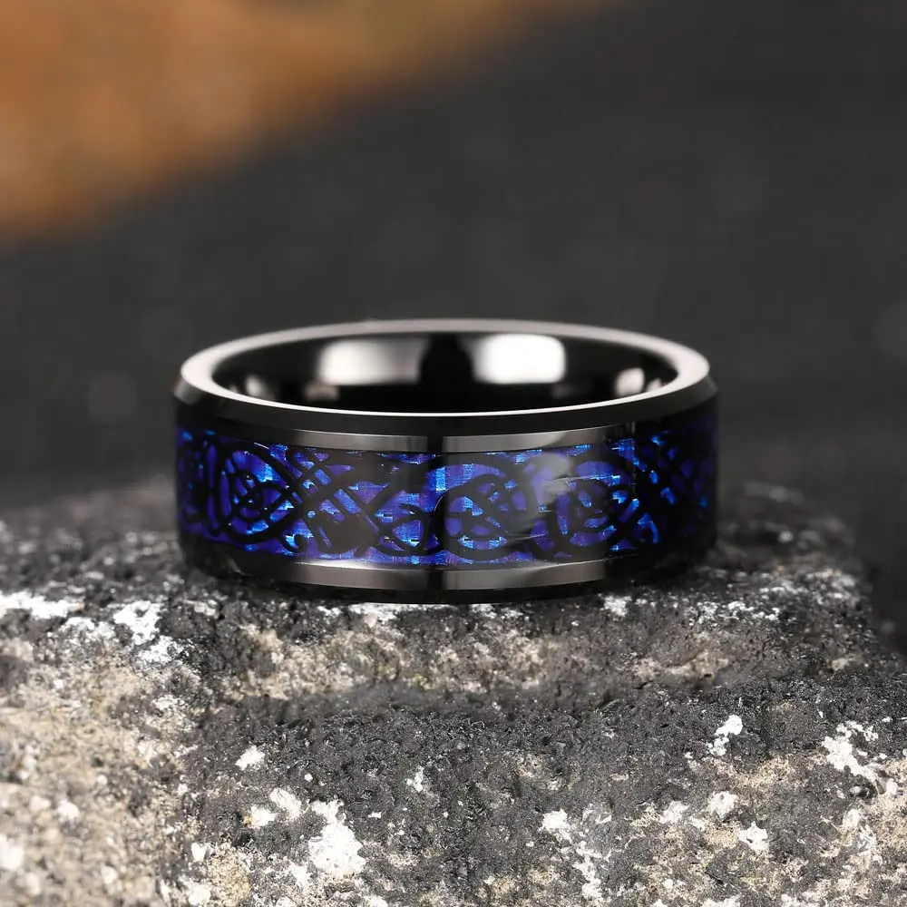 Кольца мужские вольфрамовые, модные обручальные кольца из нержавеющей стали, с кельтским драконом, с инкрустацией из синего углеродного волокна, 8 мм