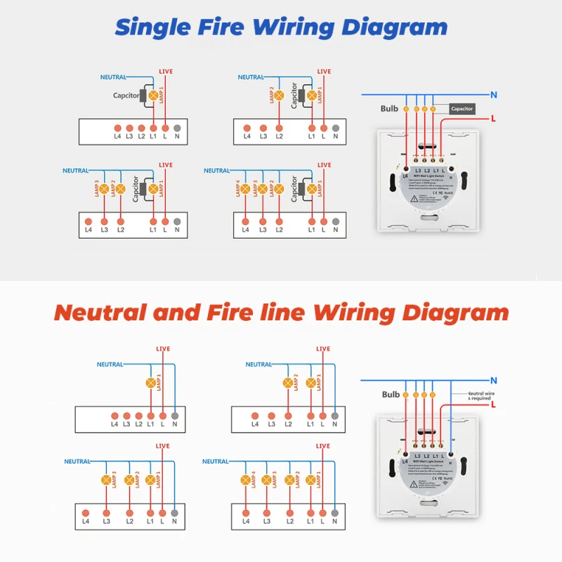 [Два способа подключения] поддерживает нейтральную систему и не нейтральную систему. Поддерживает одну пожарную систему, но вам нужен конденсатор, когда вы не используете нейтральную систему. (конденсатор включен.)