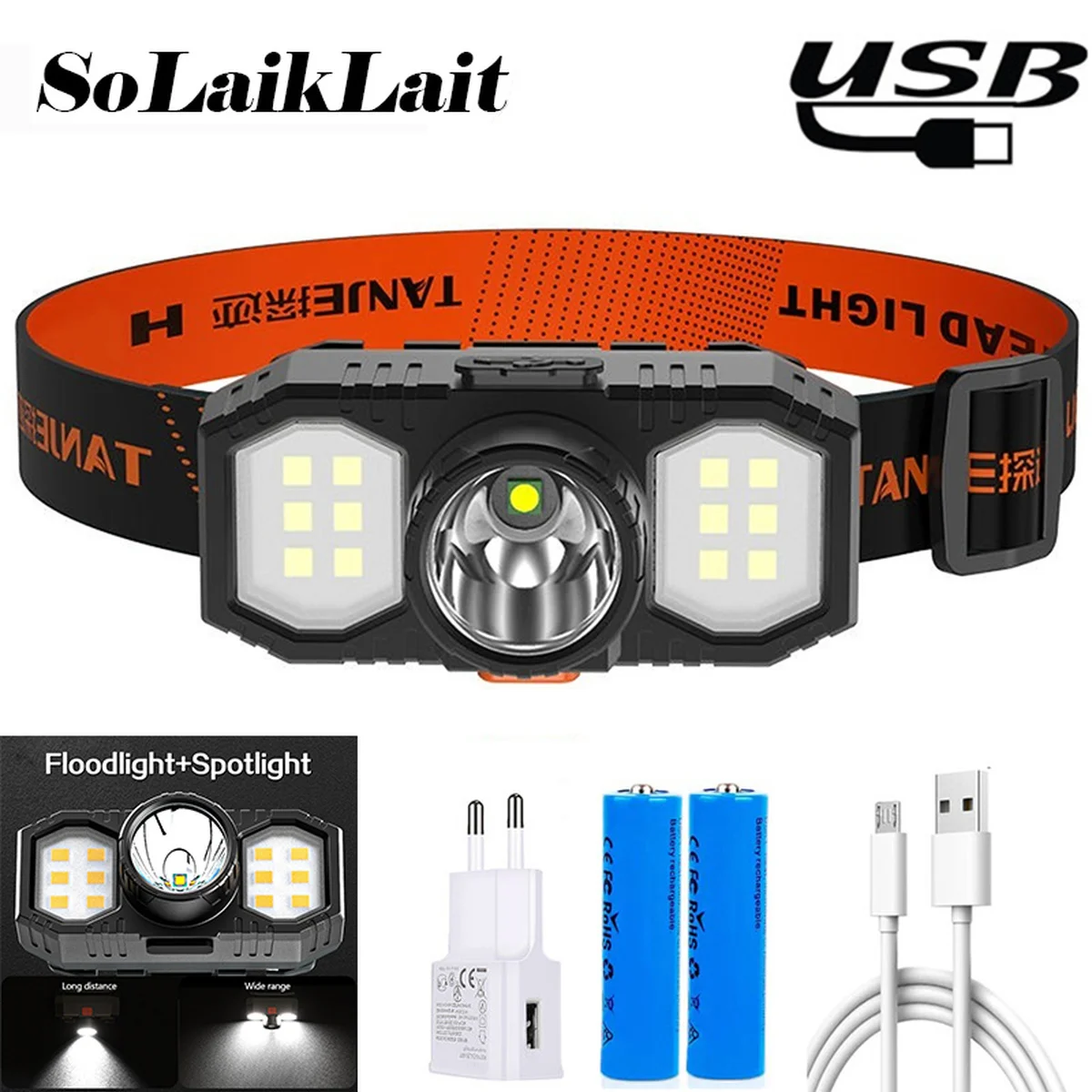 Портативный светодиодный налобный фонарь T6 с зарядкой от USB, Ультраяркий поисковый светильник для ночной рыбалки, фонарик на голову с аккумулятором 18650